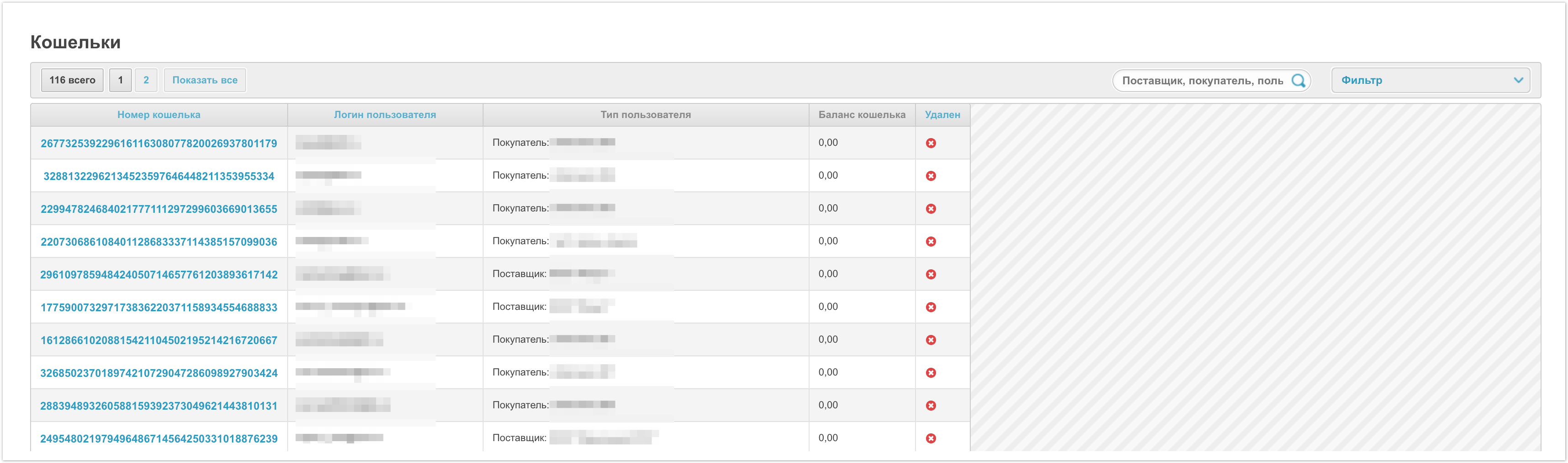 Для поиска нужного кошелька можно воспользоваться фильтрацией по типу пользователя или найти по названию пользователя через строку поиска в правой верхней части страницы.