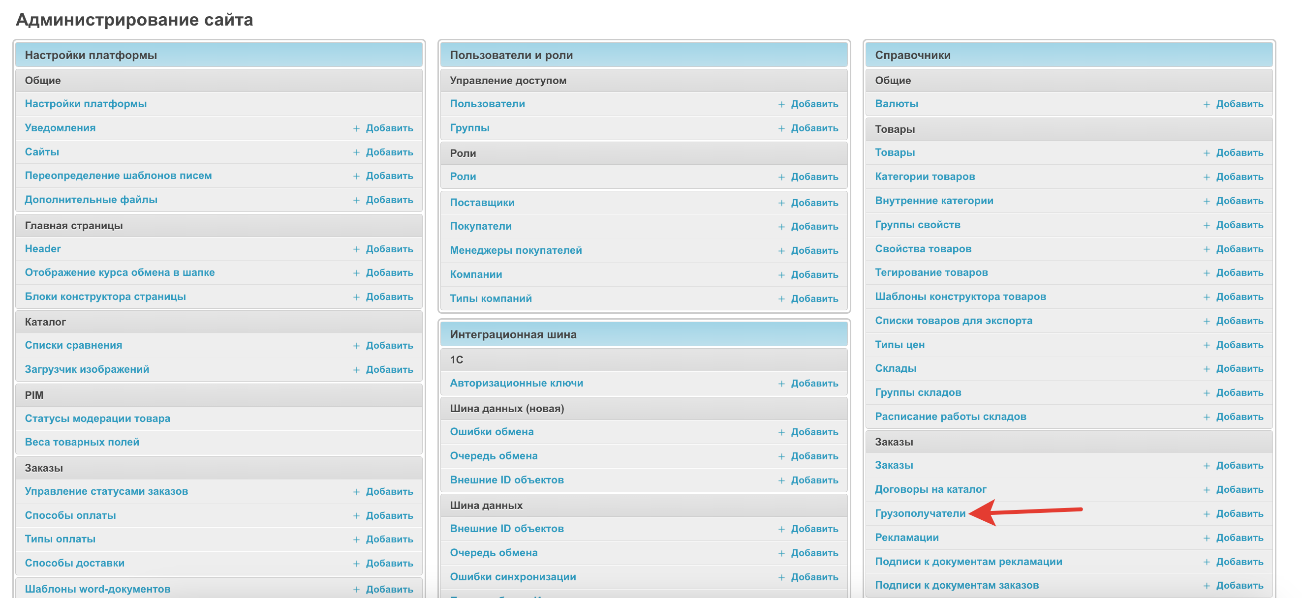 Для того чтобы создать шаблон с реквизитами, в административной панели, расположенной по адресу название_проекта.agora.ru, выберите раздел Грузополучатели: