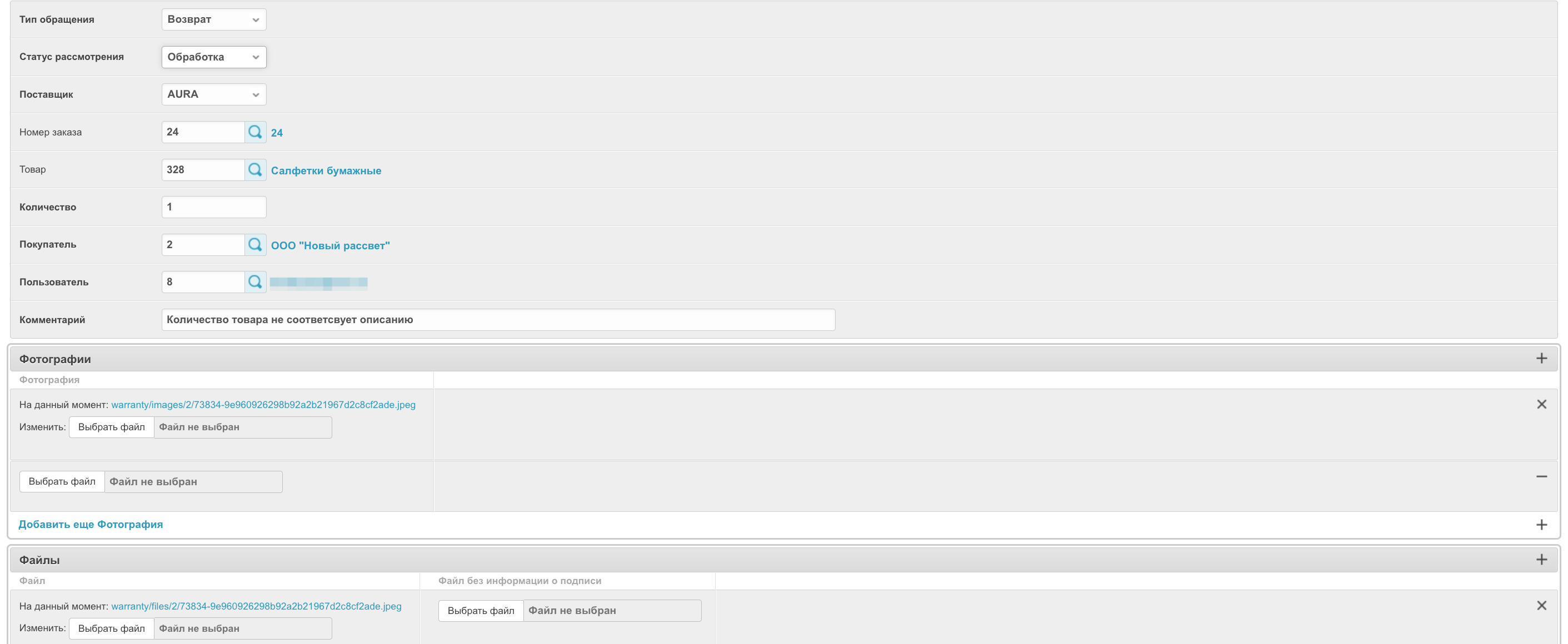 На странице кроме перечисленных выше данных можно также увидеть под каким пользователем и каким покупателем была создана рекламация, а также приложенные файлы и фотографии.