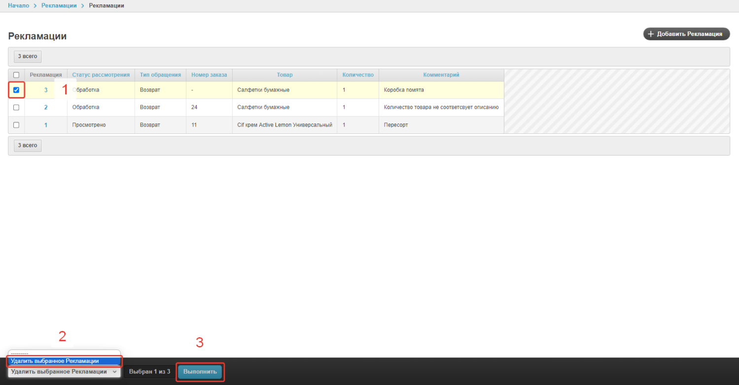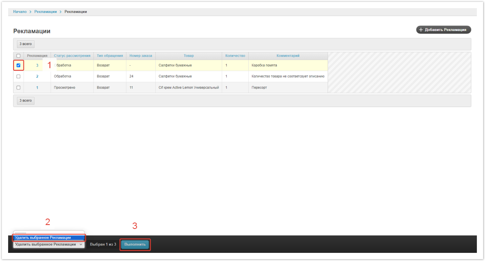 Для удаления рекламации достаточно выделить ее в списке, в выпадающем меню внизу страницы выбрать Удалить выбранное Рекламации и кликнуть по кнопке Выполнить.