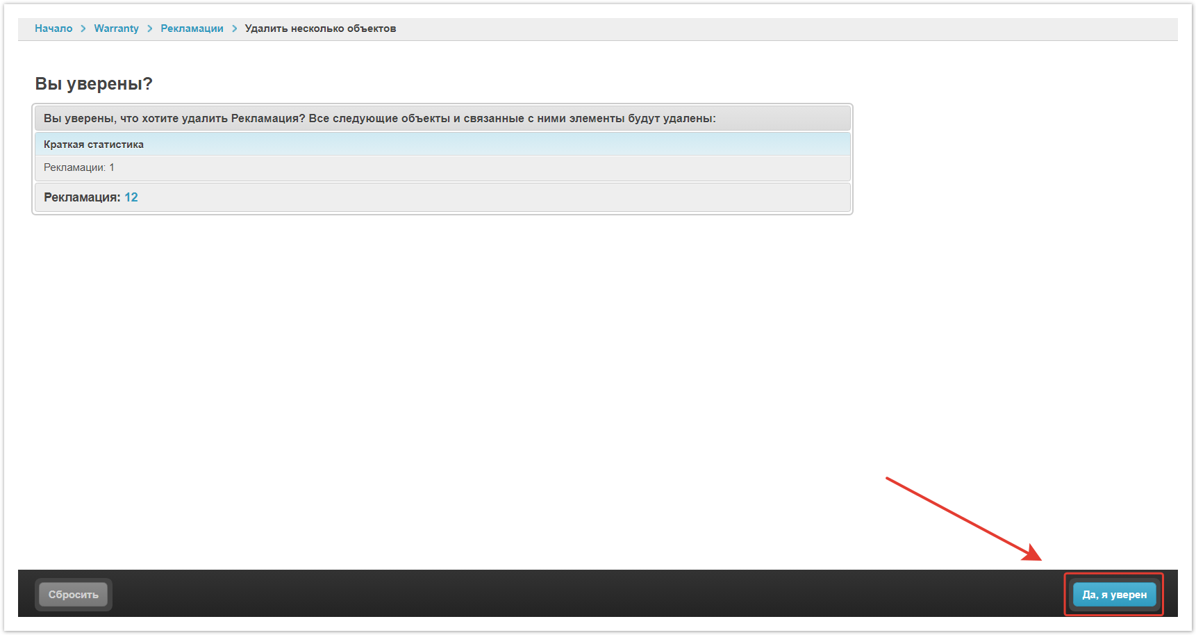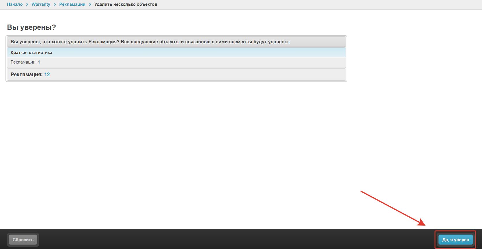 Откроется меню подтверждения удаления Рекламации, в котором необходимо проверить, корректную ли Рекламацию вы выбрали и нажать Да, я уверен.