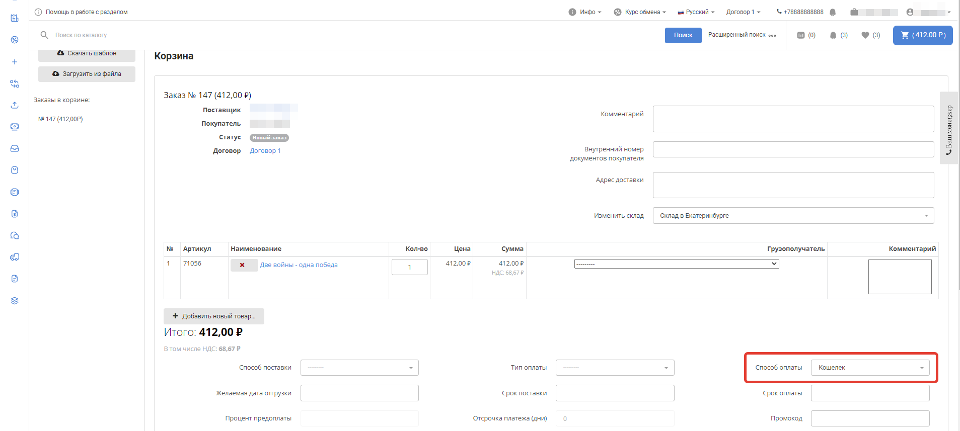 Пользователь может выбрать внутренний кошелек как способ оплаты. В этом случае средства будут списываться с его счёта в размере суммы заказа.