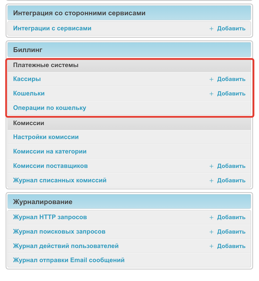В административной панели добавится блок Платежные системы, где можно назначить кассиров и администрировать кошельки пользователей.