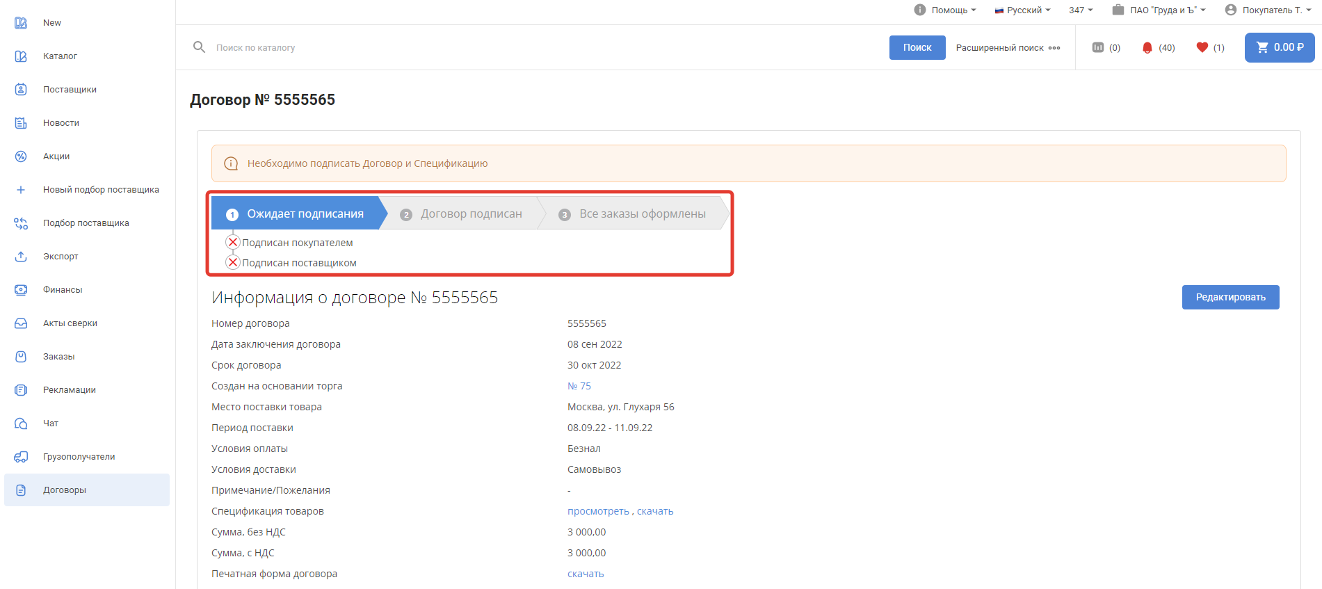 Поставщик после перехода в договор видит аналогичную страницу, за исключением кнопки Редактировать, она доступна только покупателю, организовавшему торг.