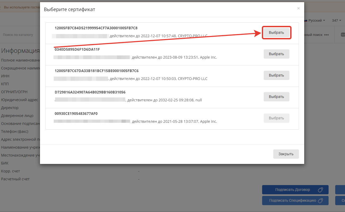 При клике по кнопке подписания откроется список электронных подписей, которыми можно подписать документы. Для подписи нажмите на кнопку Выбрать у нужной подписи.
