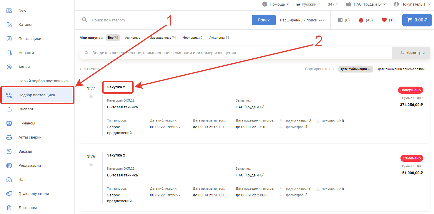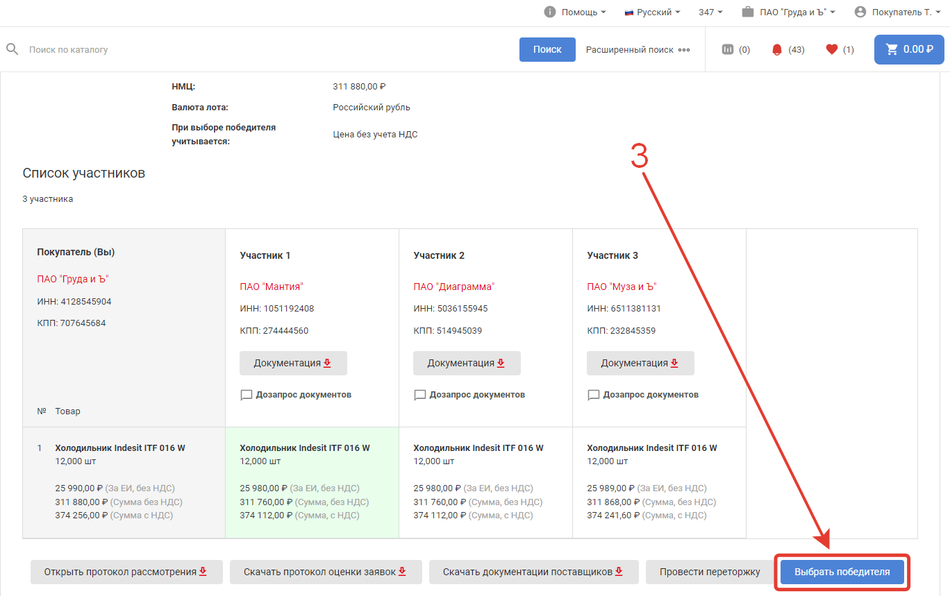 По завершении процедуры торга покупателю необходимо выбрать победителя. Для этого в разделе Подбор поставщика перейдите в нужный торг и кликните по кнопке Выбрать победителя внизу страницы.
