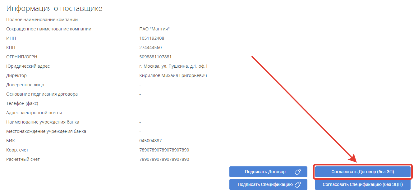 И по кнопке Согласовать Спецификацию (без ЭЦП), чтобы перевести договор в следующий статус.