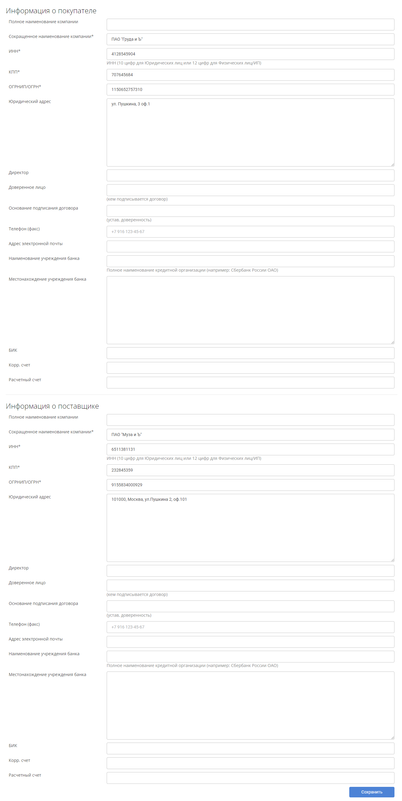 Далее следует информация о покупателе и поставщике. Данные из личных кабинетов подтягиваются автоматически, но их можно изменить при необходимости. Обязательные поля помечены значком *.