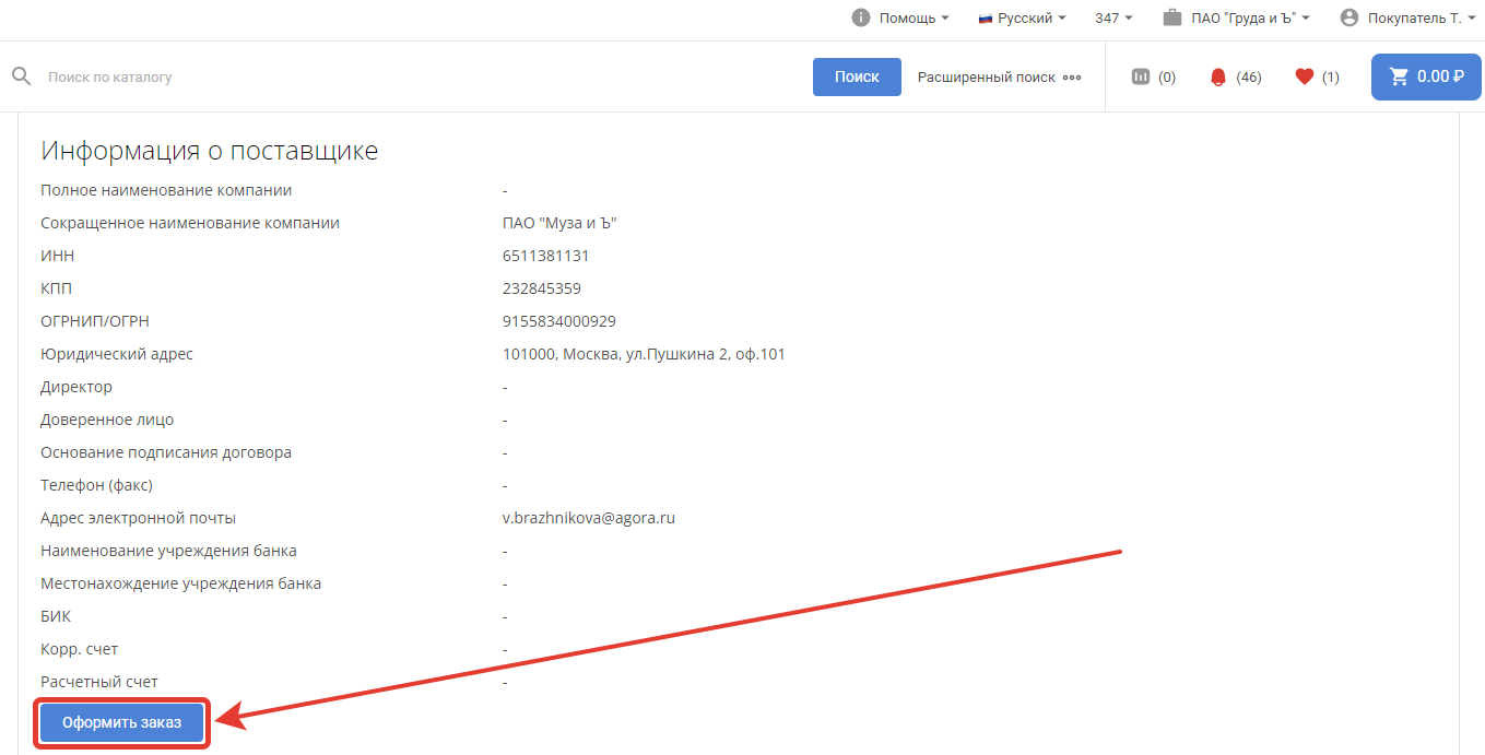 Когда договор подписан или согласован с двух сторон, на странице договора начнет отображаться кнопка Оформить заказ.