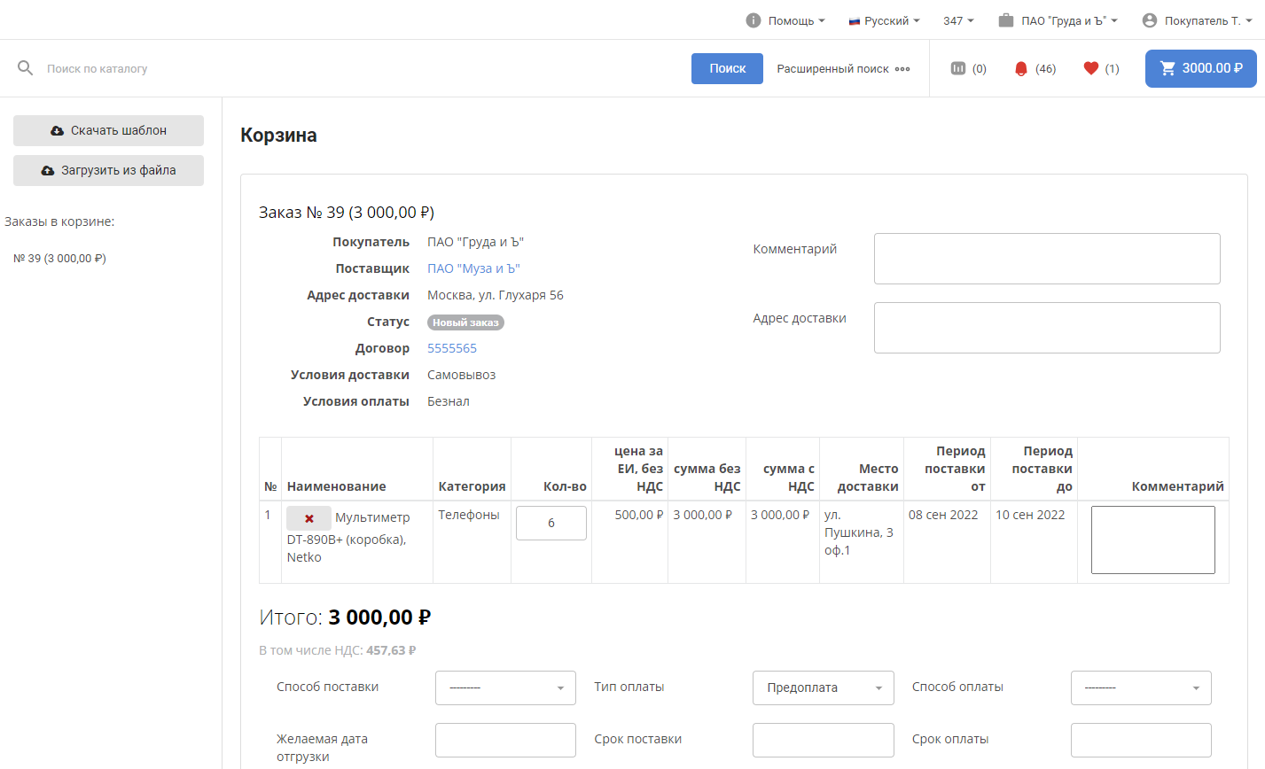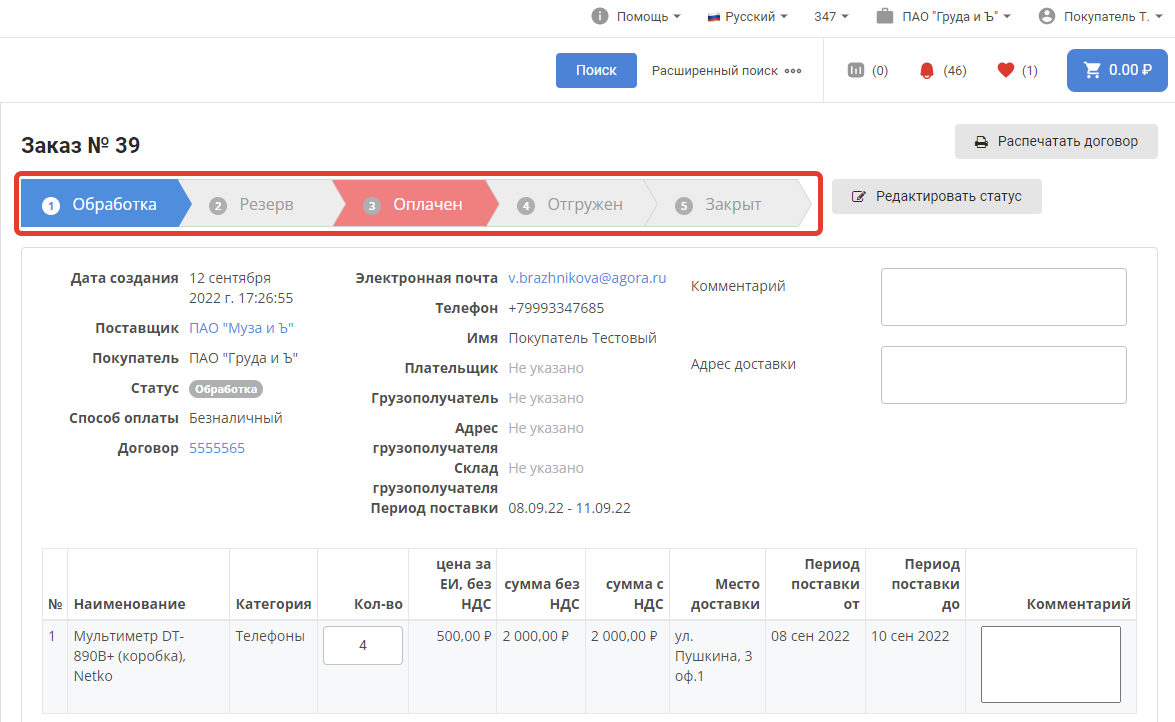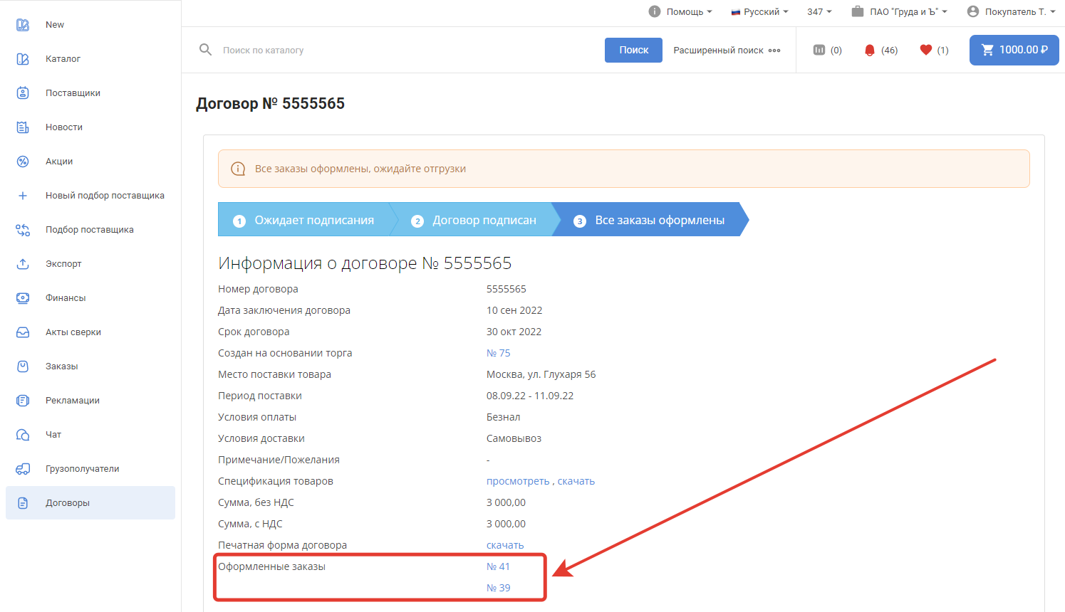 Когда покупатель оформит заказы на все товары из закупки, статус договора изменится на Все заказы оформлены. Все ссылки на заказы находятся в поле Оформленные заказы.