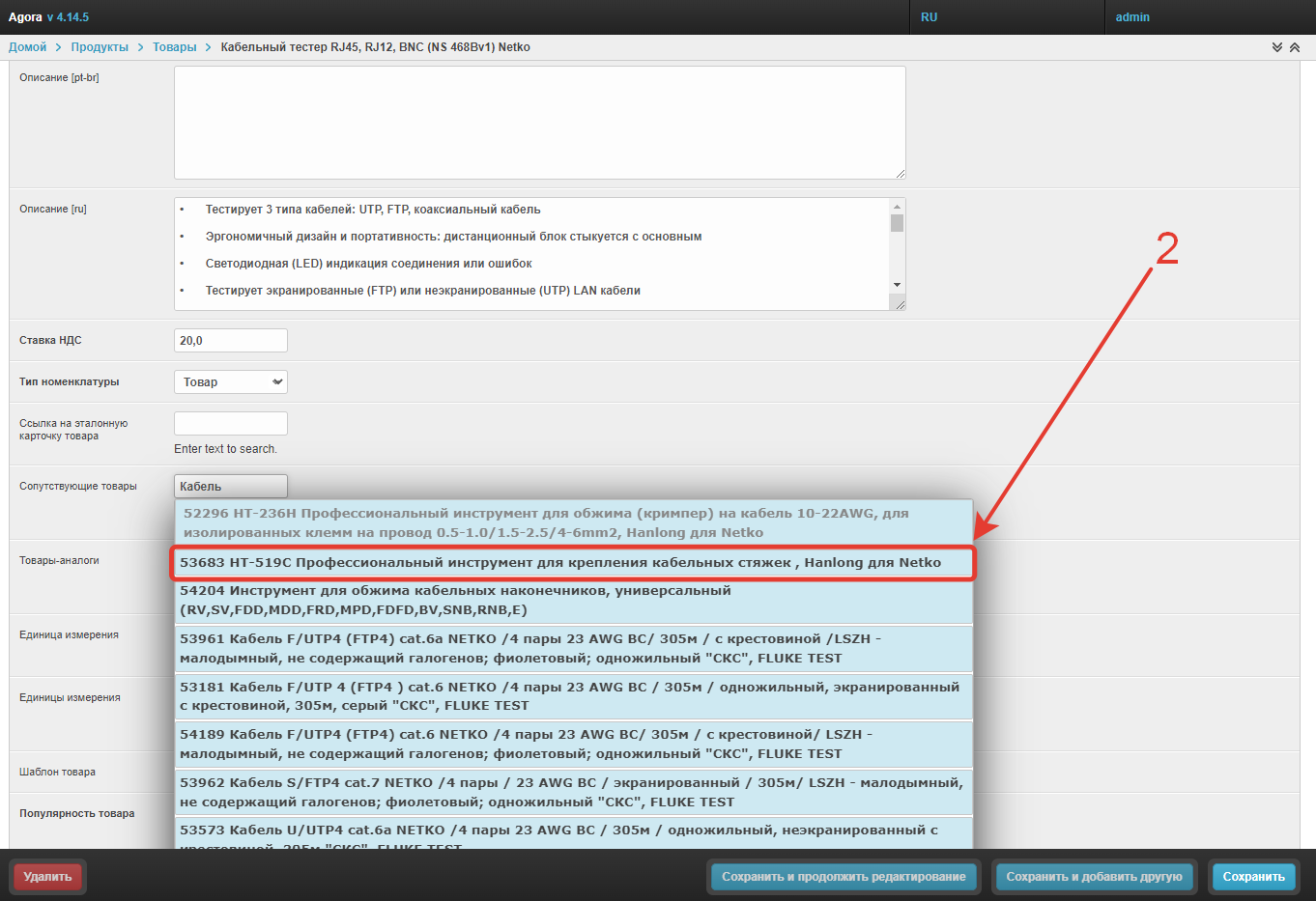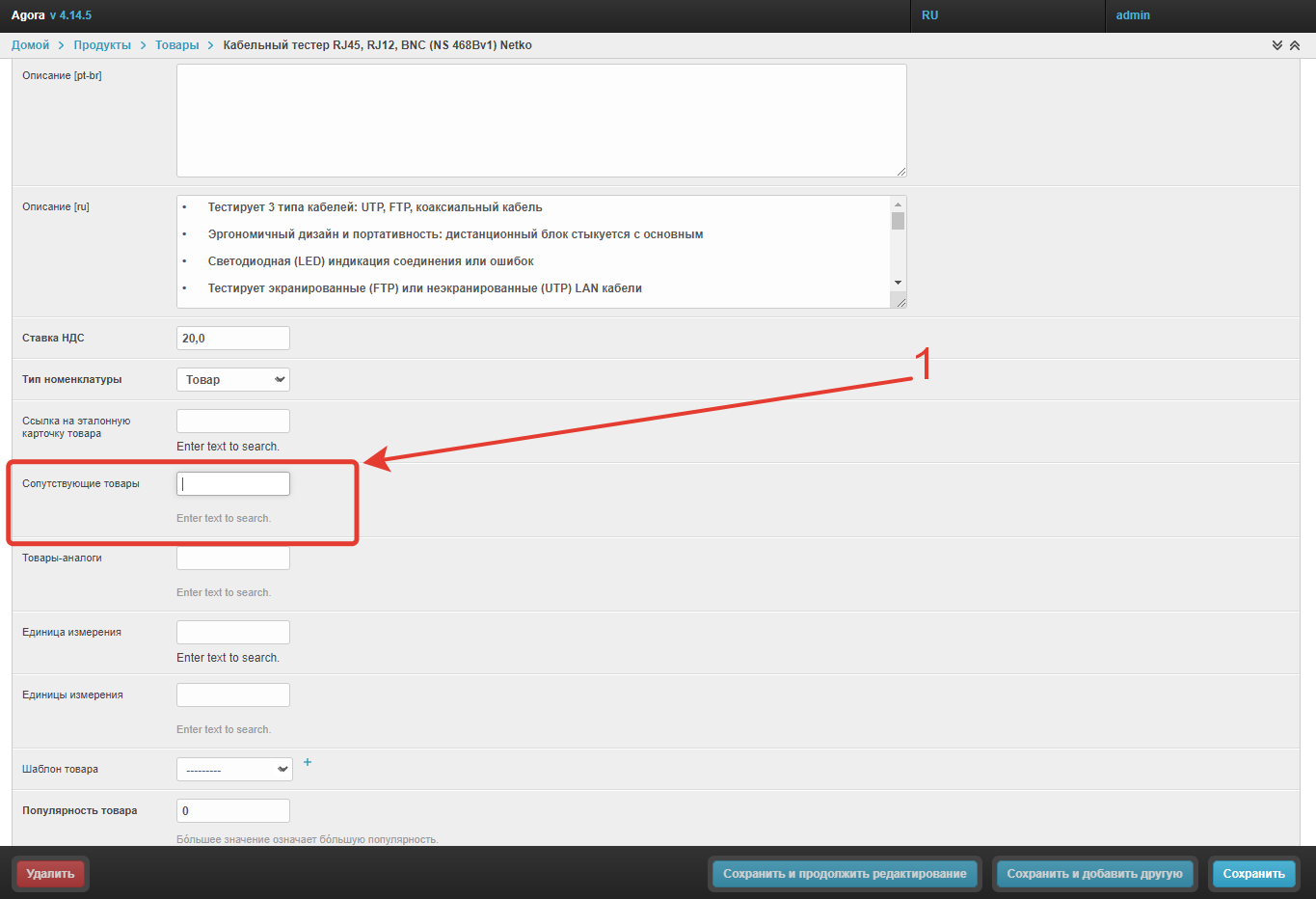 В открывшемся окне найдите поле Сопутствующие товары и начните вводить наименование тех продуктов, которые должны отображаться в карточке товара, затем выберите необходимые в выпадающем меню.
