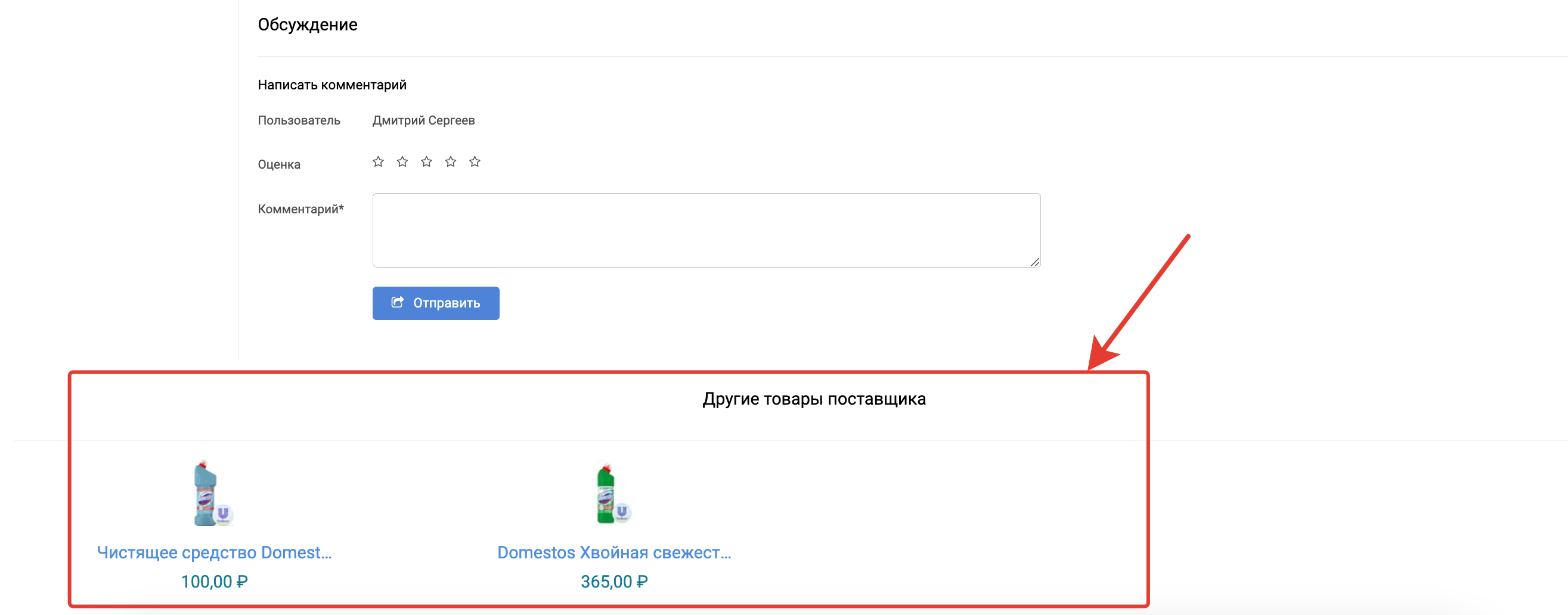 Добавленные товары отобразятся в каталоге покупателя в карточке товара внизу страницы, под блоком с обсуждением.
