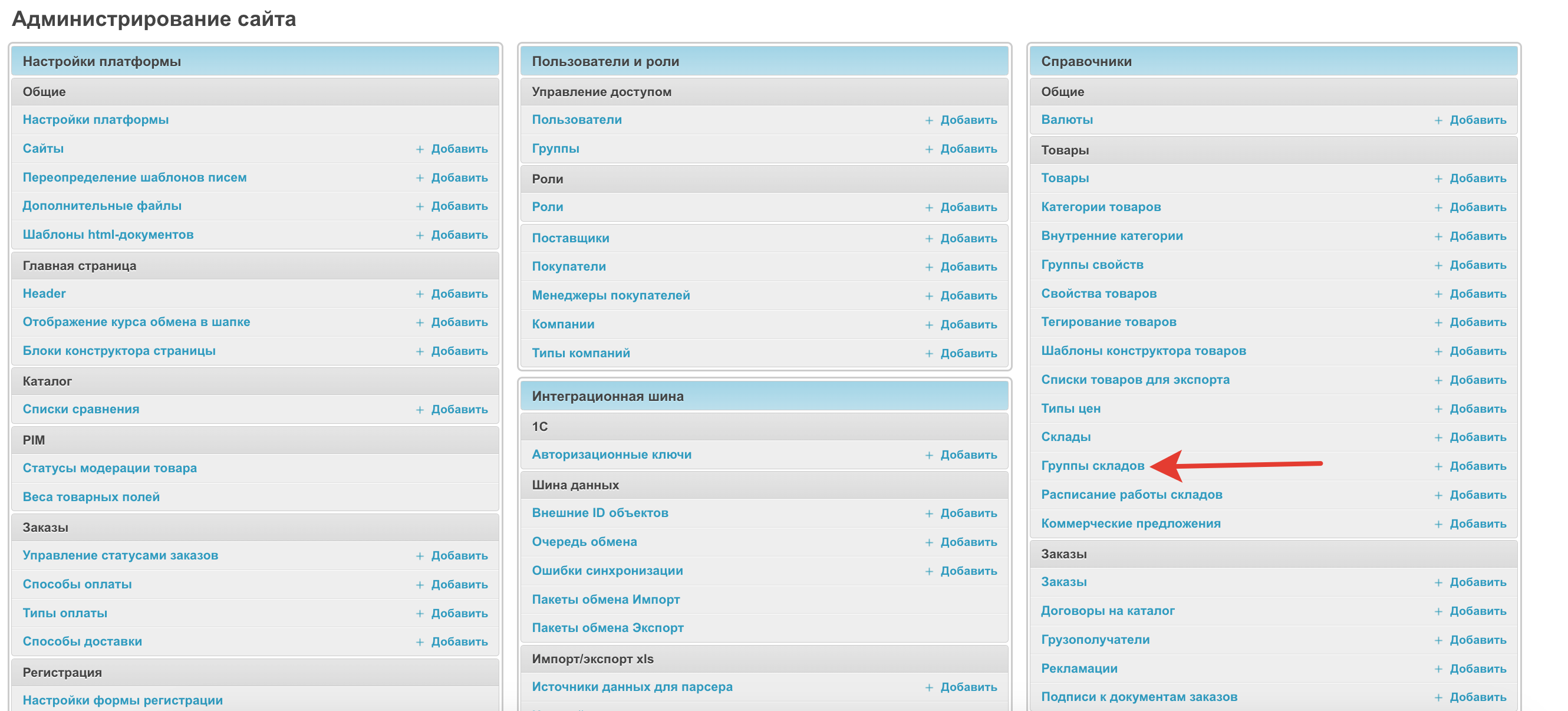 Чтобы открыть данный раздел, в административной панели, расположенной по адресу название_проекта.agora.ru/admin, нажмите Группы складов: