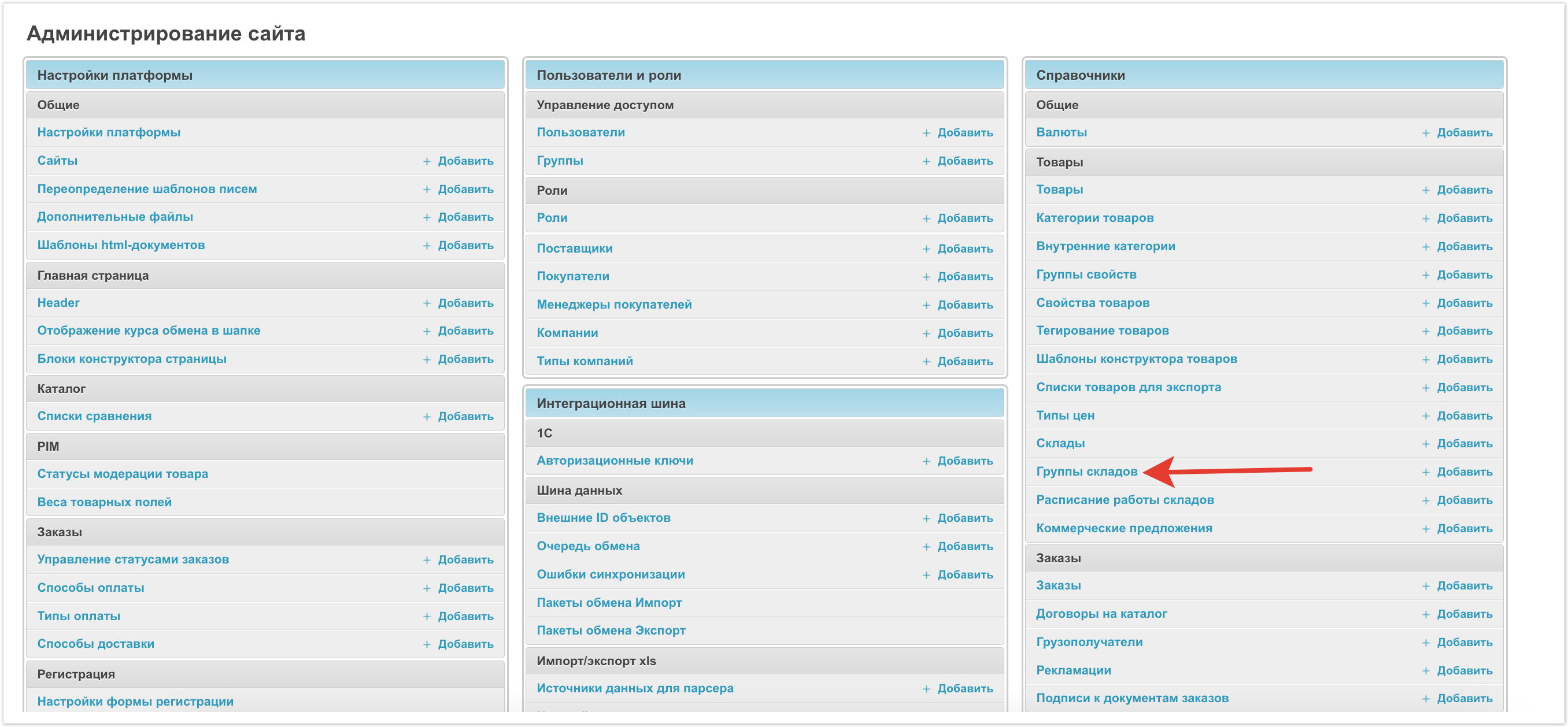 Раздел Группы складов в административной панели позволяет заводить данные об одном и том же складе, если разные поставщики по-разному завели название данного склада.