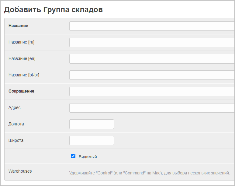 - Warehouses (данное поле появляется только при редактировании склада, здесь можно выбрать склады, принадлежащие к данной группе складов).