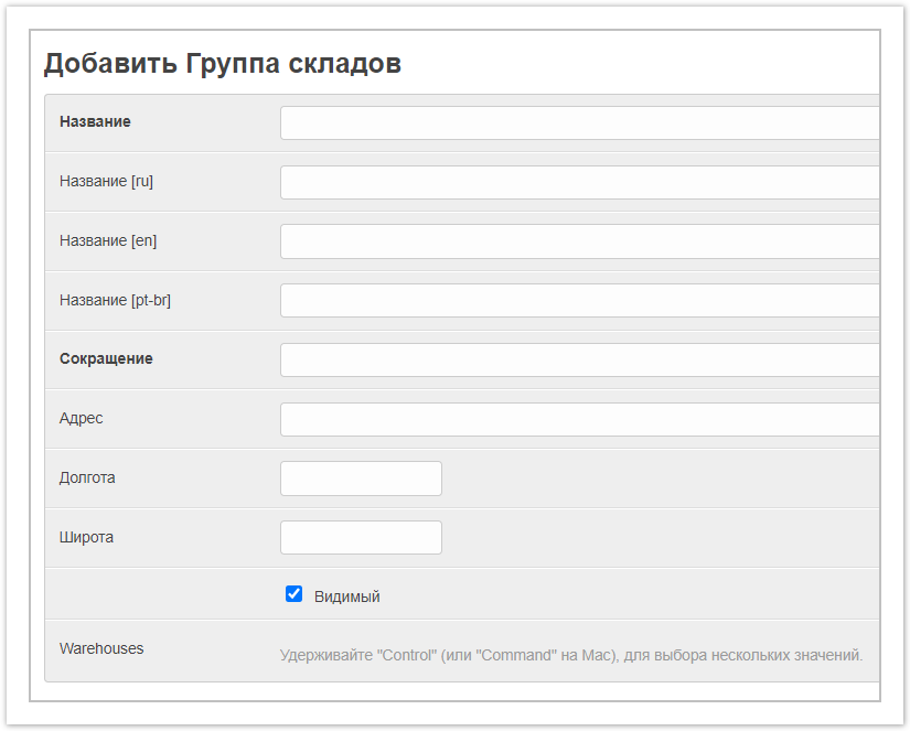 • Warehouses (данное поле появляется только при редактировании склада, здесь можно выбрать склады, принадлежащие к данной группе складов).