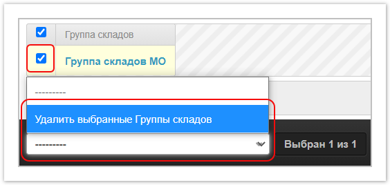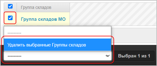 Для удаления группы складов выберите склад и внизу окна выберите Удалить выбранные Группы складов: