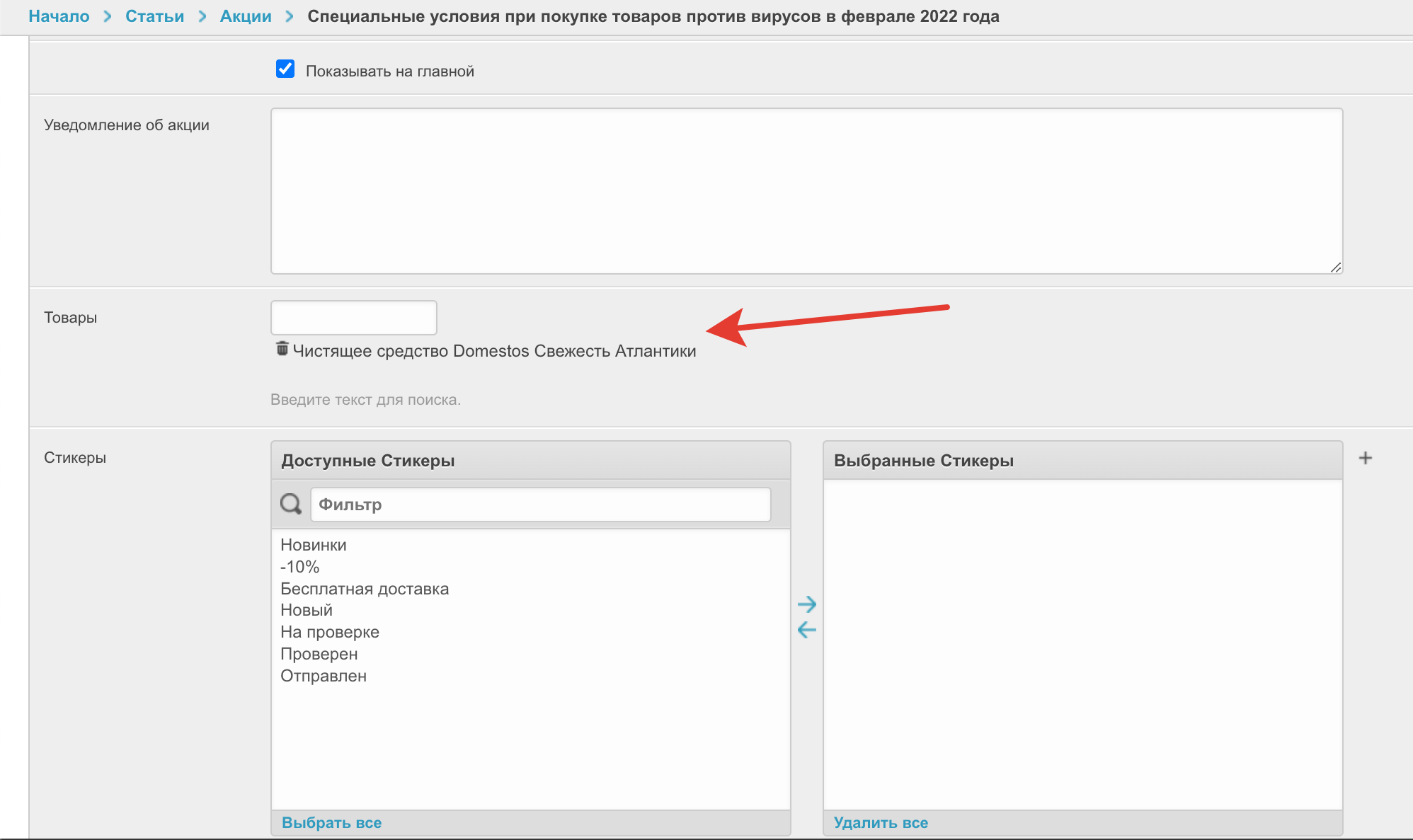 Показывать на главной — чекбокс, используемый для настройки размещения акции на главной странице сайта.