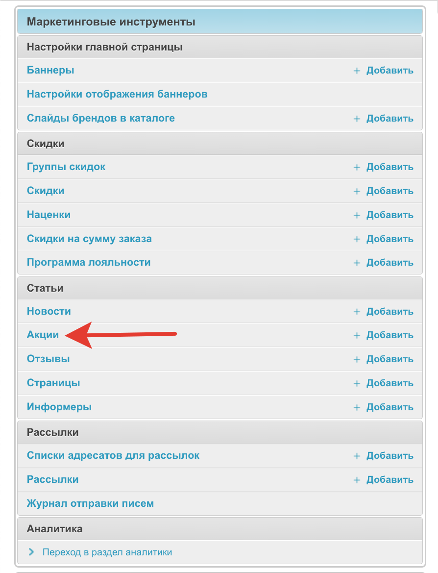 Раздел Акции в административной панели используется для настройки новостей о промо-акциях и скидках на товары.