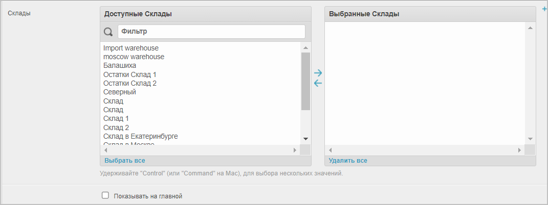 Склады — выбор склада, на товары которого будет действовать акция.
