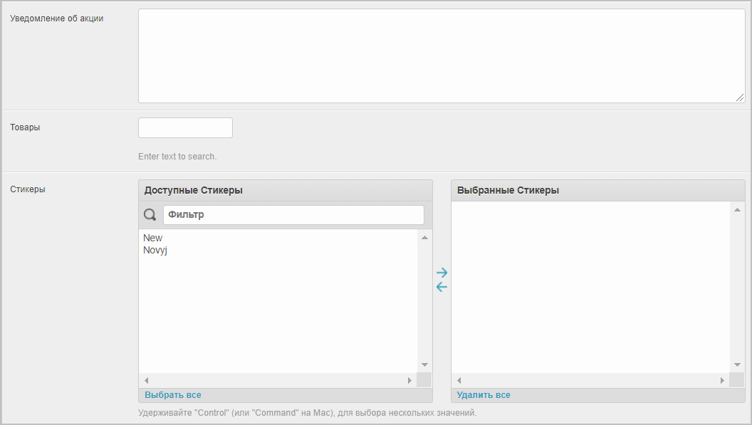 Товары — поле контекстного поиска товара по названию для добавления в акцию. Выберите соответствующий товар из выпадающего списка и кликните на него, товар будет добавлен в акцию.