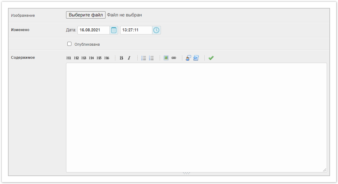 Опубликована — чекбокс для публикации или прекращения публикации новости.