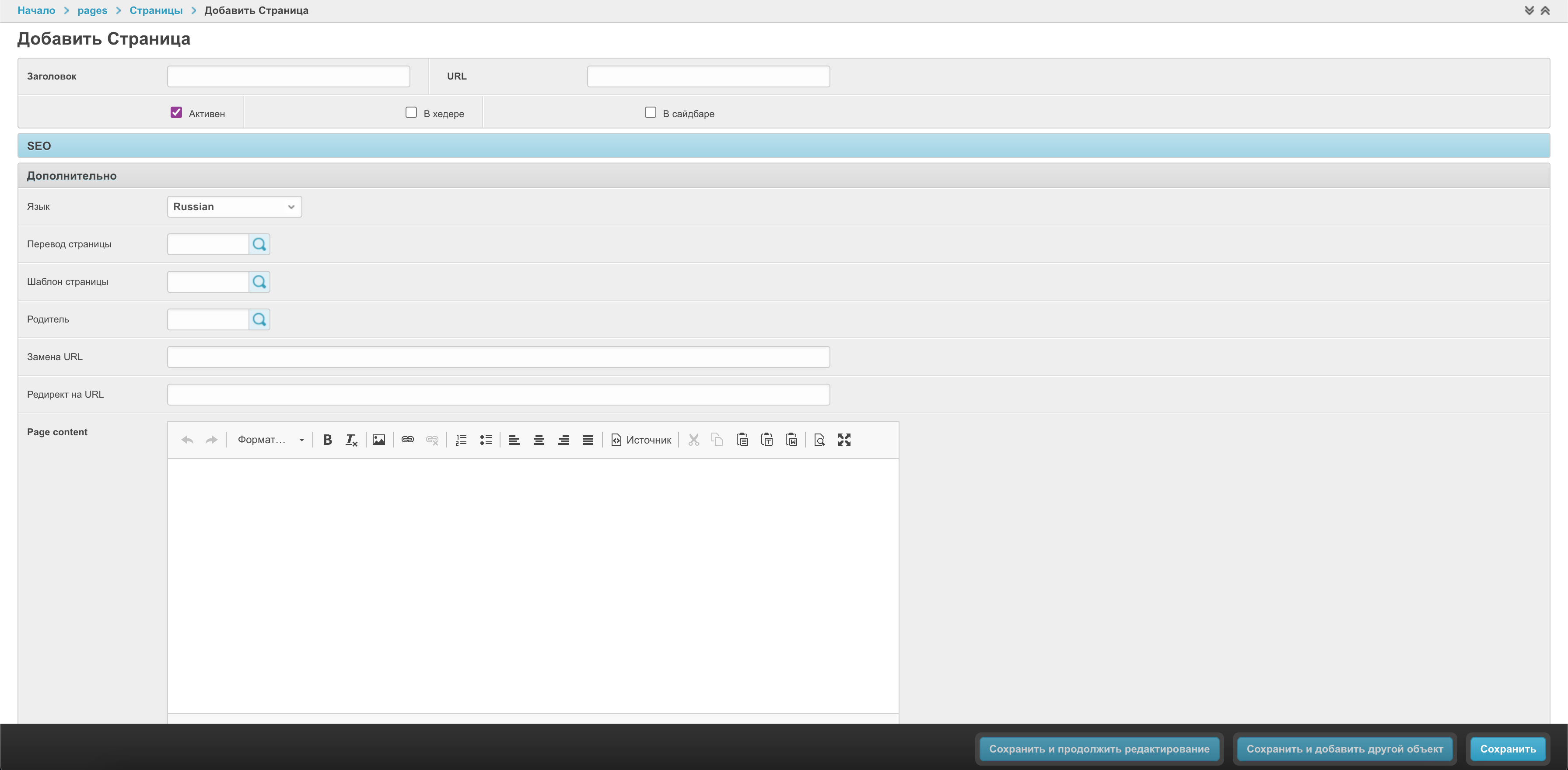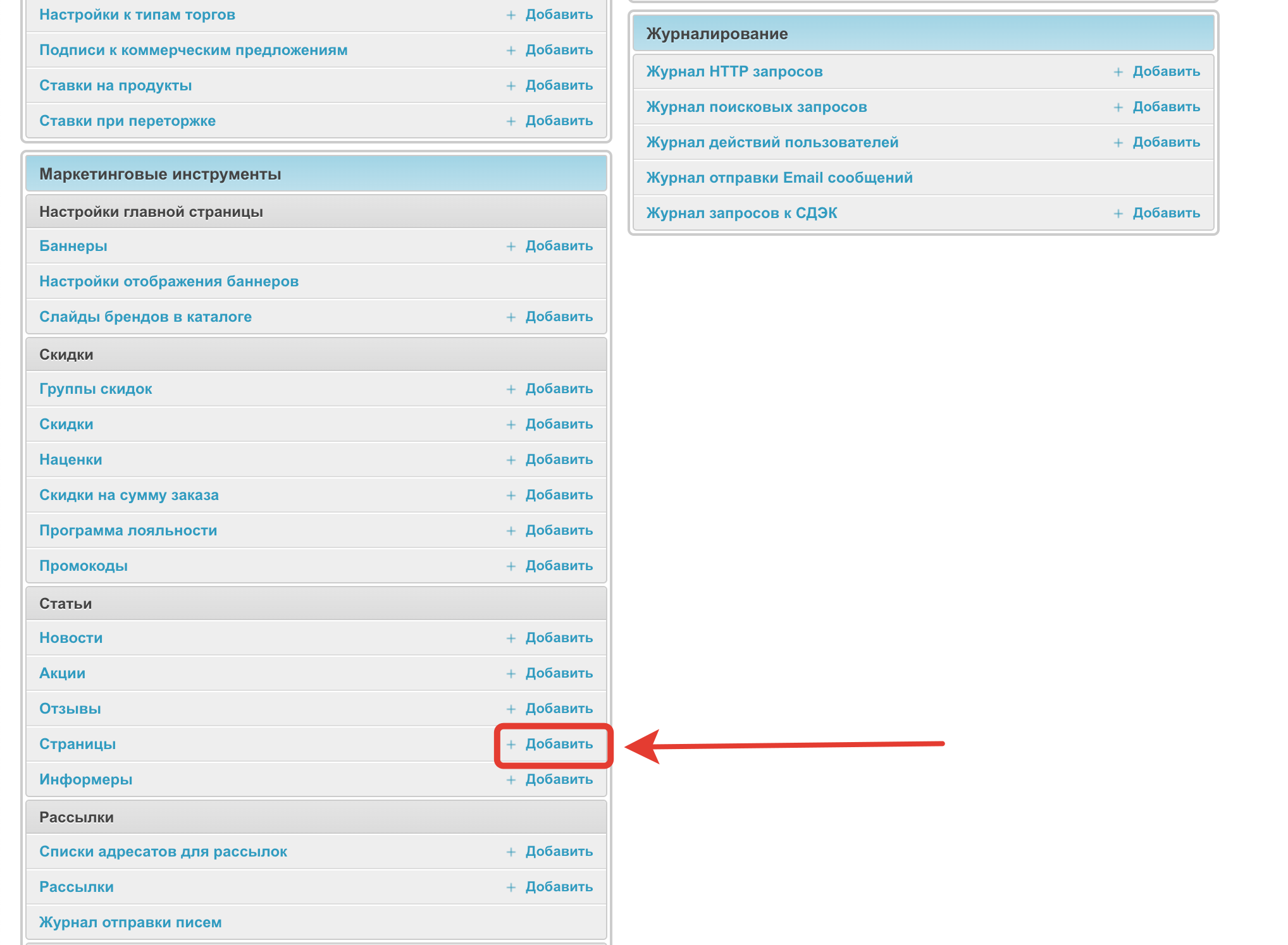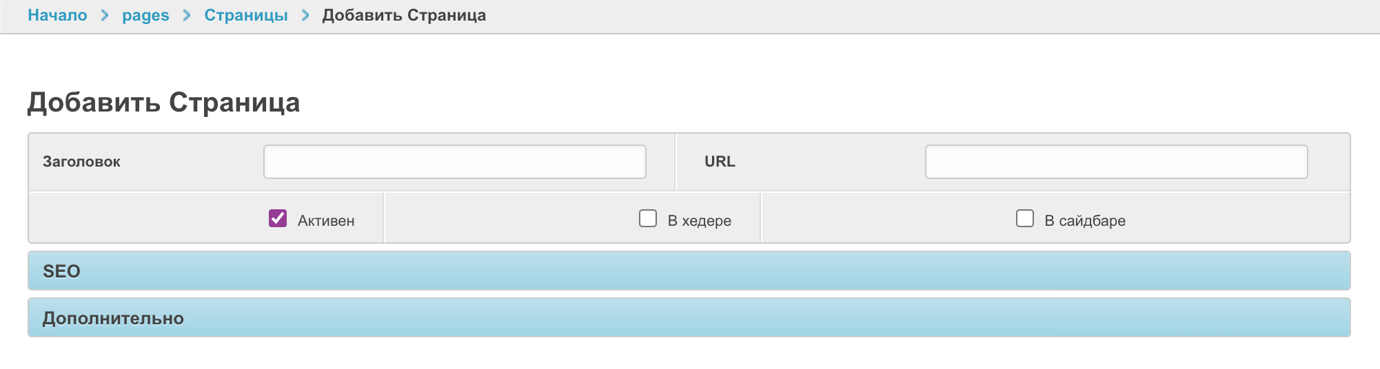 Создать информационную страницу можно, нажав рядом с разделом Страницы административной панели на кнопку Добавить.