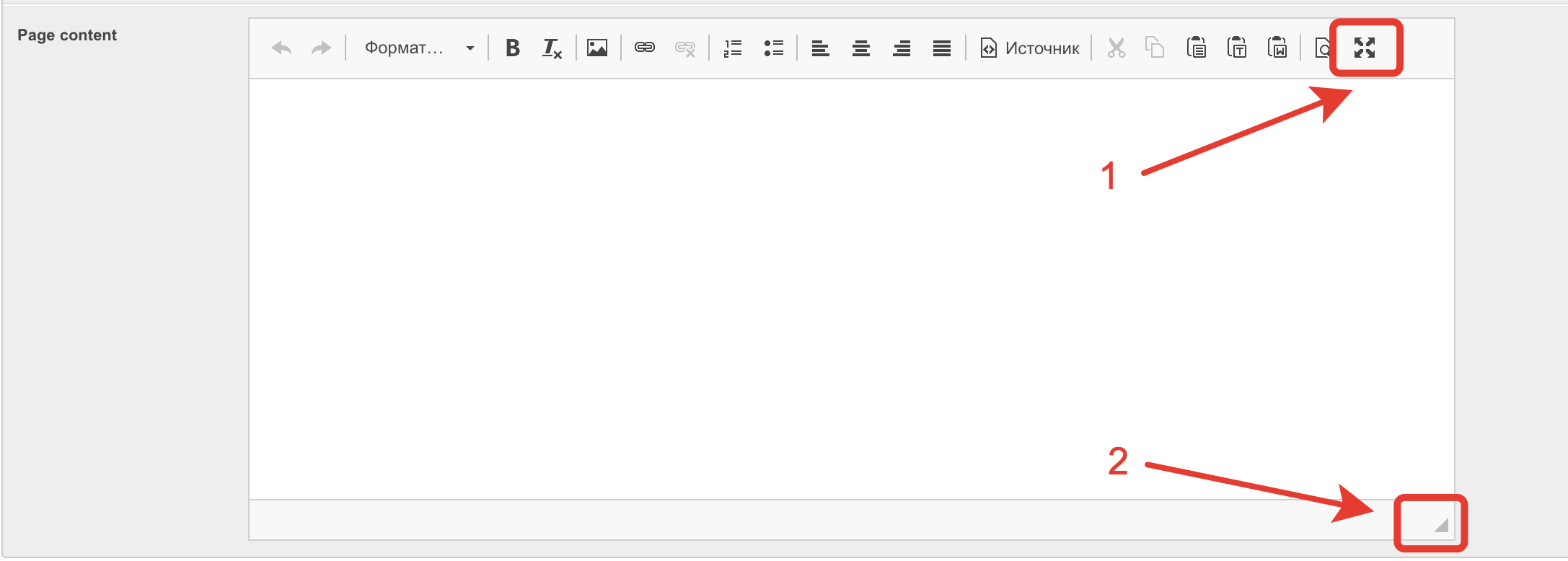 В разделе Page content настраивается внешний вид страницы. Для удобства работы форму редактирования можно развернуть на весь экран с помощью кнопки или растянуть окно на нужный размер за правый нижний угол.