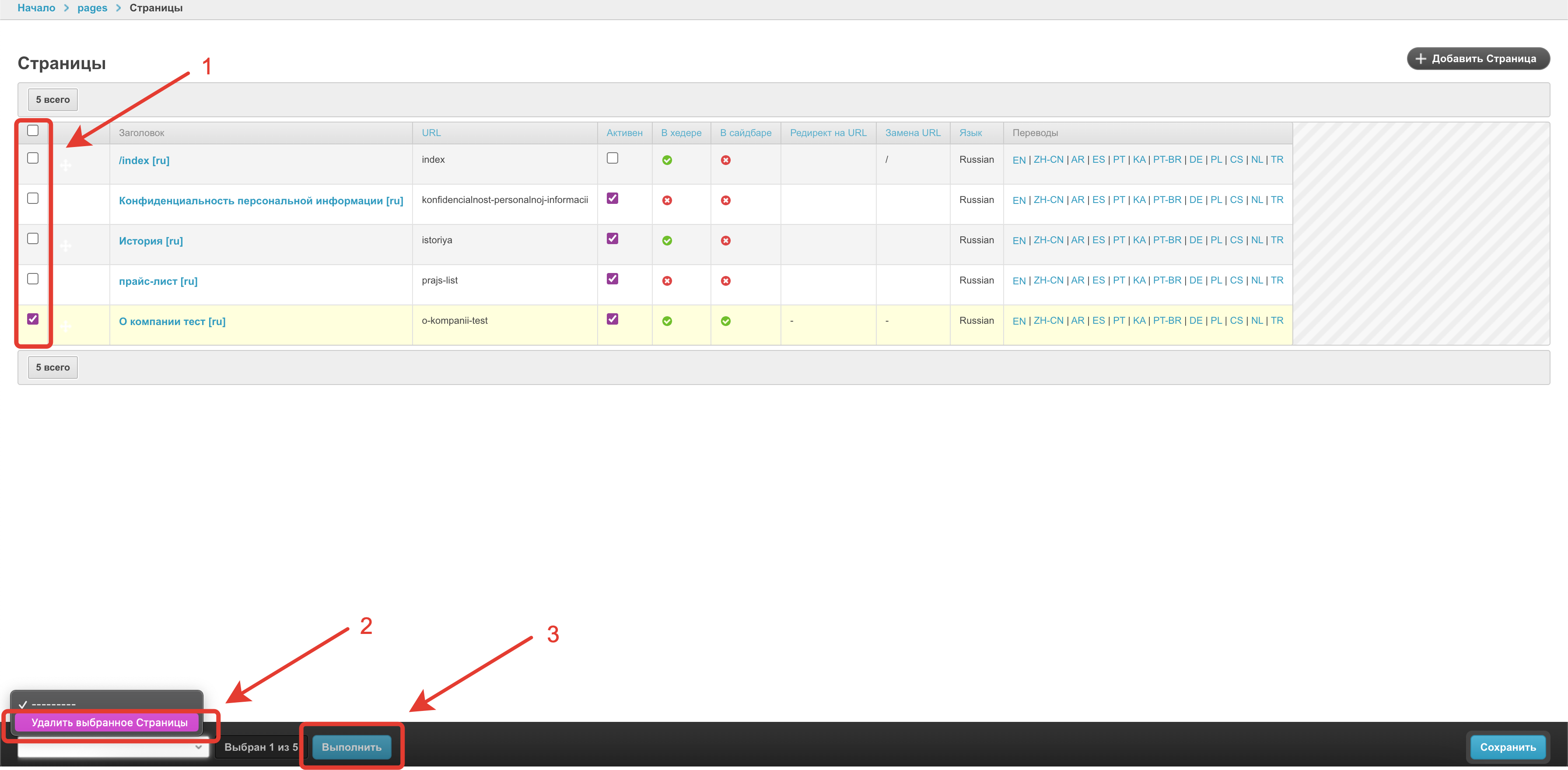 Если вы хотите удалить ненужные страницы, отметьте их с помощью чекбокса, а затем выберите Удалить выбанные страницы в выпадающем меню внизу экрана и нажмите кнопку Выполнить.