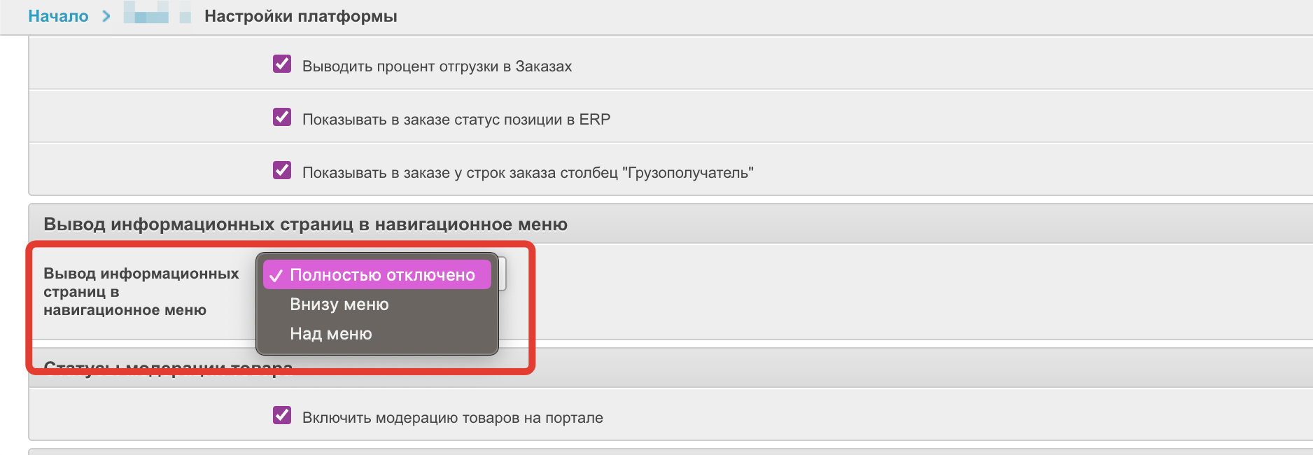 В разделе Настройки платформы можно выбрать, в верхней или нижней части сайдбара сайта Agora будет отображаться блок Информация. Это настройка актуальна, если вы хотите выводить информационные страницы не в хедере сайта, а в сайдбаре (левом меню).
