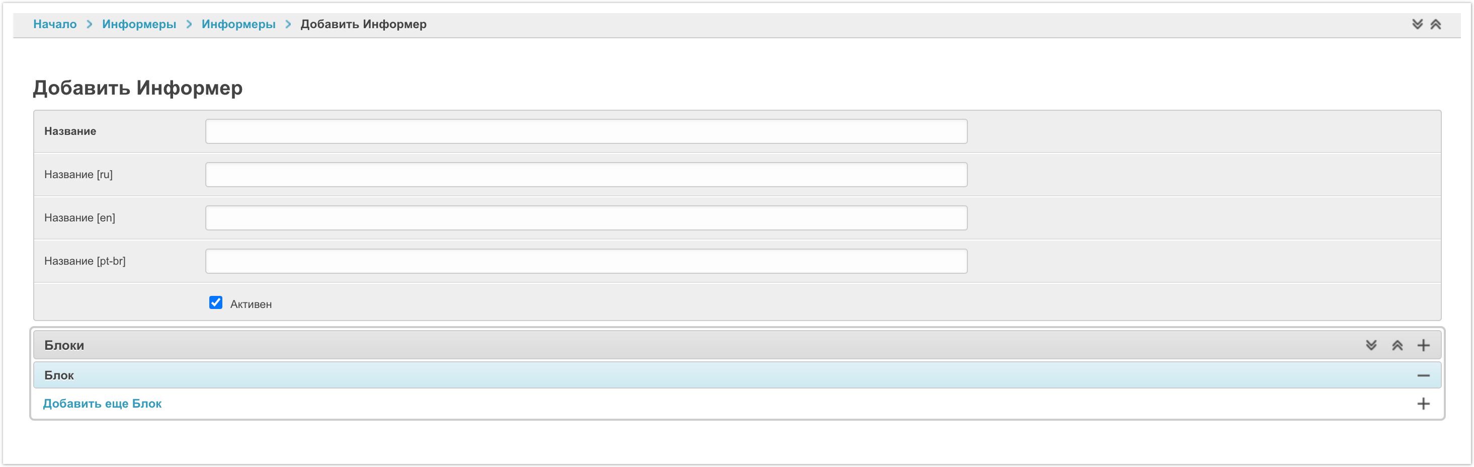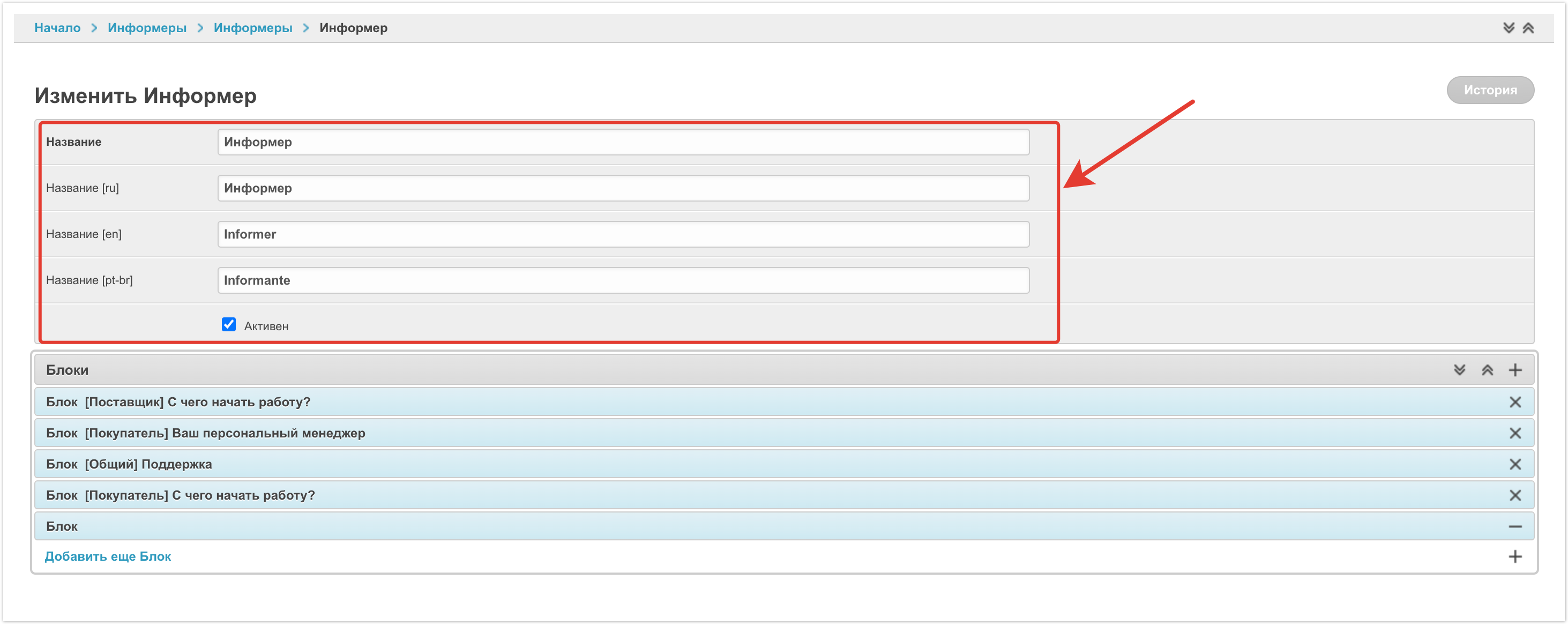 В верхней части страницы выводится название на всех подключенных на проекте языках и чек бокс Активен, который отвечает за включение всплывающего окна.