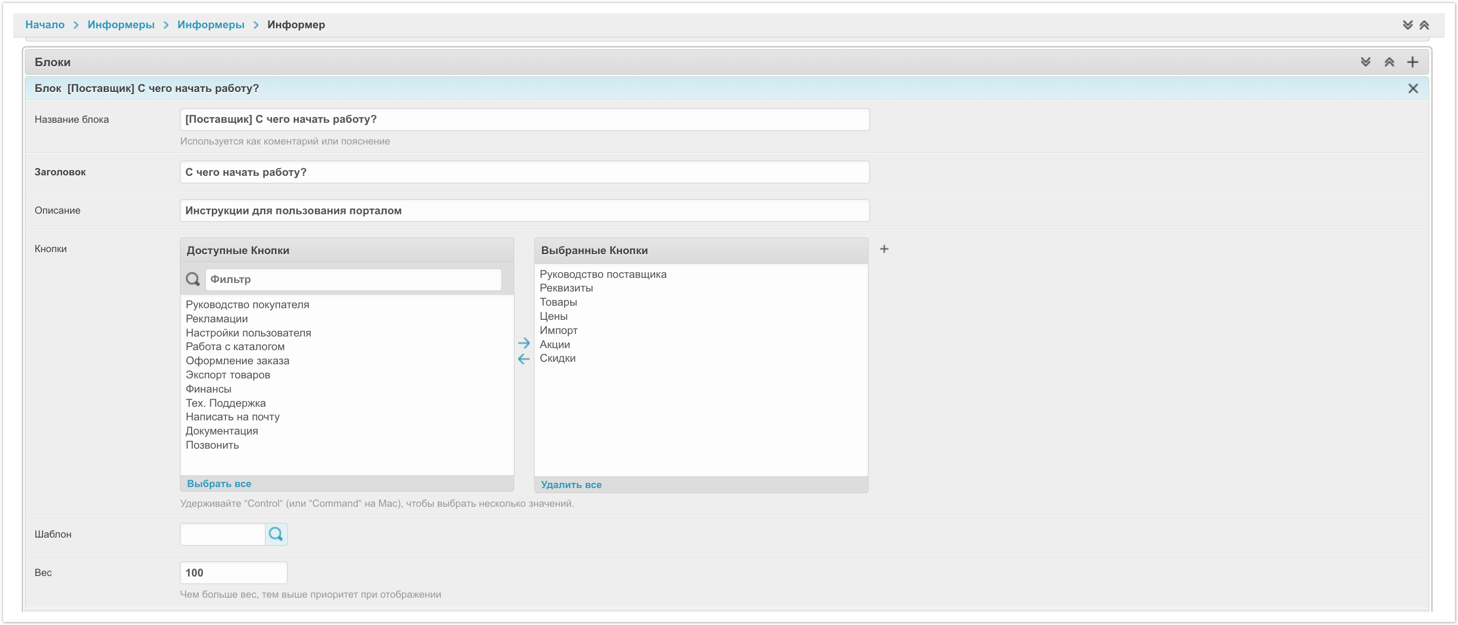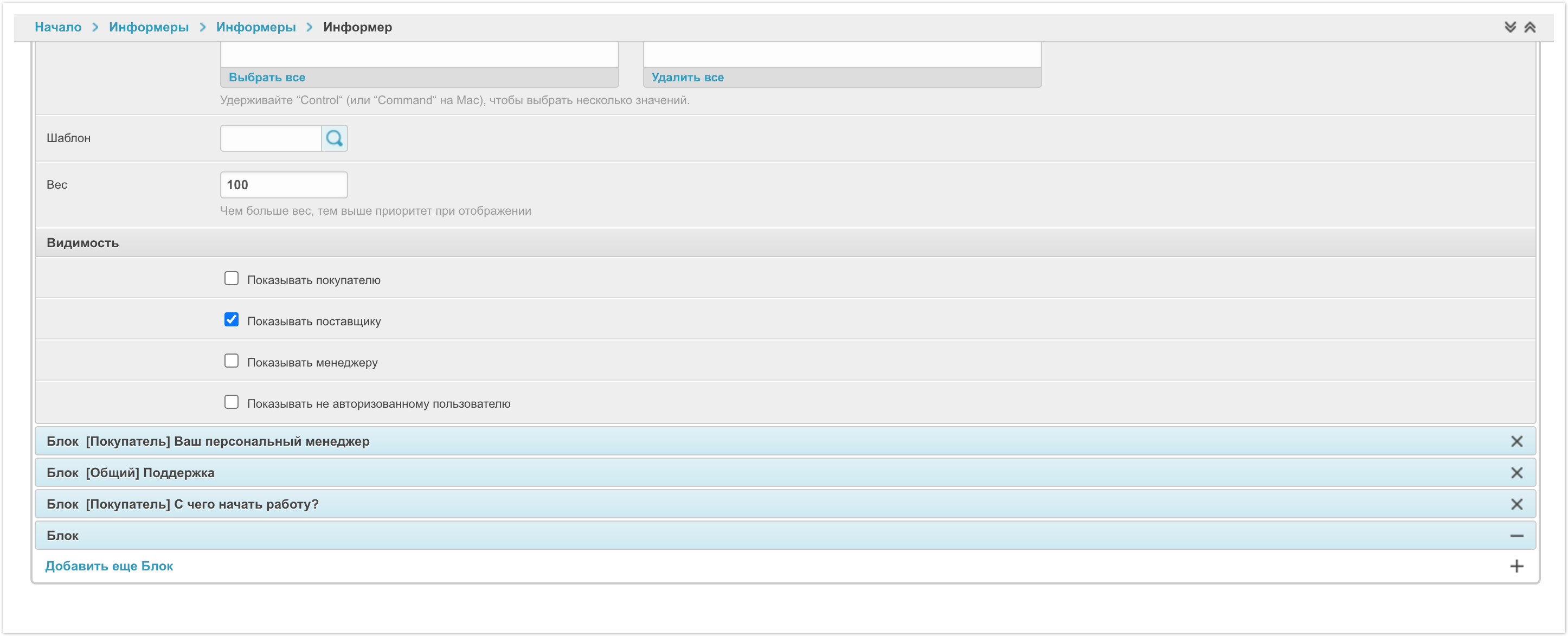 Аналогичным образом можно настроить персональный виджет для поставщика, для менеджера и для всех неавторизованных пользователей, если это потребуется. Все блоки добавляются в рамках одного информера и активным может быть только один информер.