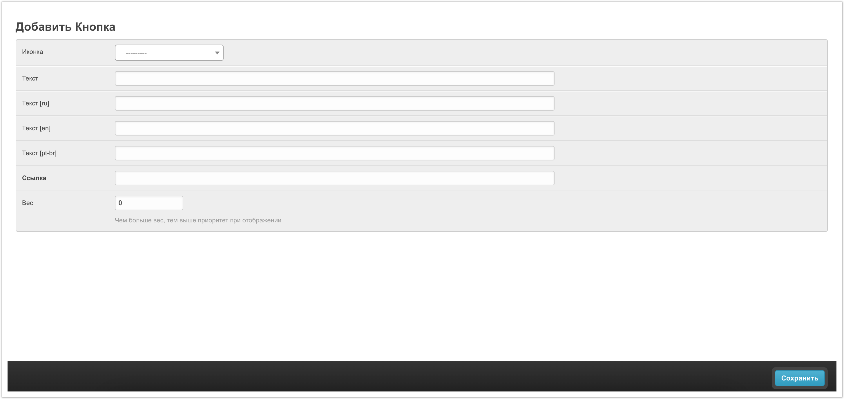Кнопки - здесь выбираются из списка кнопки, которые будут выводится в блоке. Набор кнопок стандартный и ссылки по ним ведут на документацию Agora. Но также можно добавить свои кнопки, для этого нужно нажать на +, а затем выбрать иконку, текст кнопки, ссылку и вес. После сохранения кнопку можно будет добавить на форму.