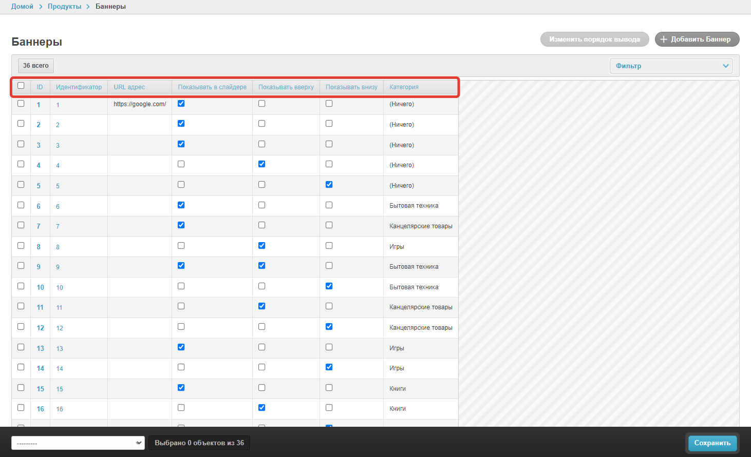 Вы можете видеть все настройки в сводной таблице, а также управлять, на каких страницах проекта будут отображаться баннеры, с помощью чекбоксов раздела Баннеры административной панели.