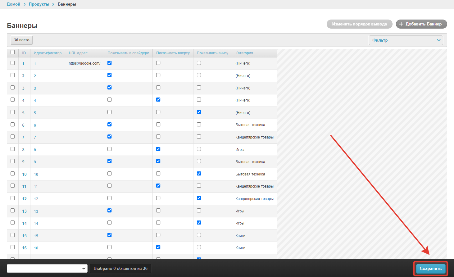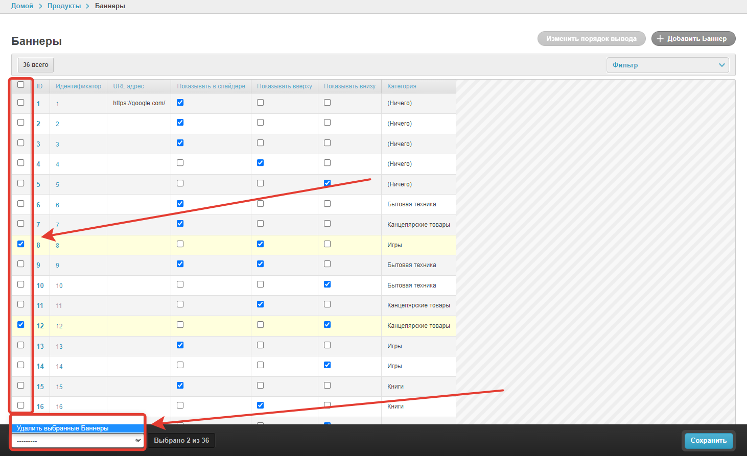 Есть возможность удалить один или несколько баннеров с помощью кнопки Удалить выбранные Баннеры.