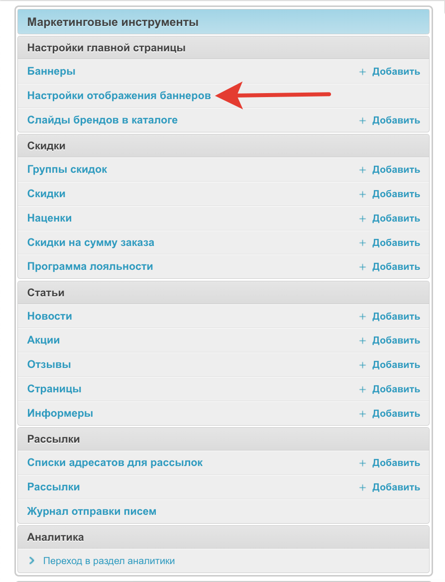 В этом разделе административной панели изменяется тип и способ вывода баннеров в каталоге.