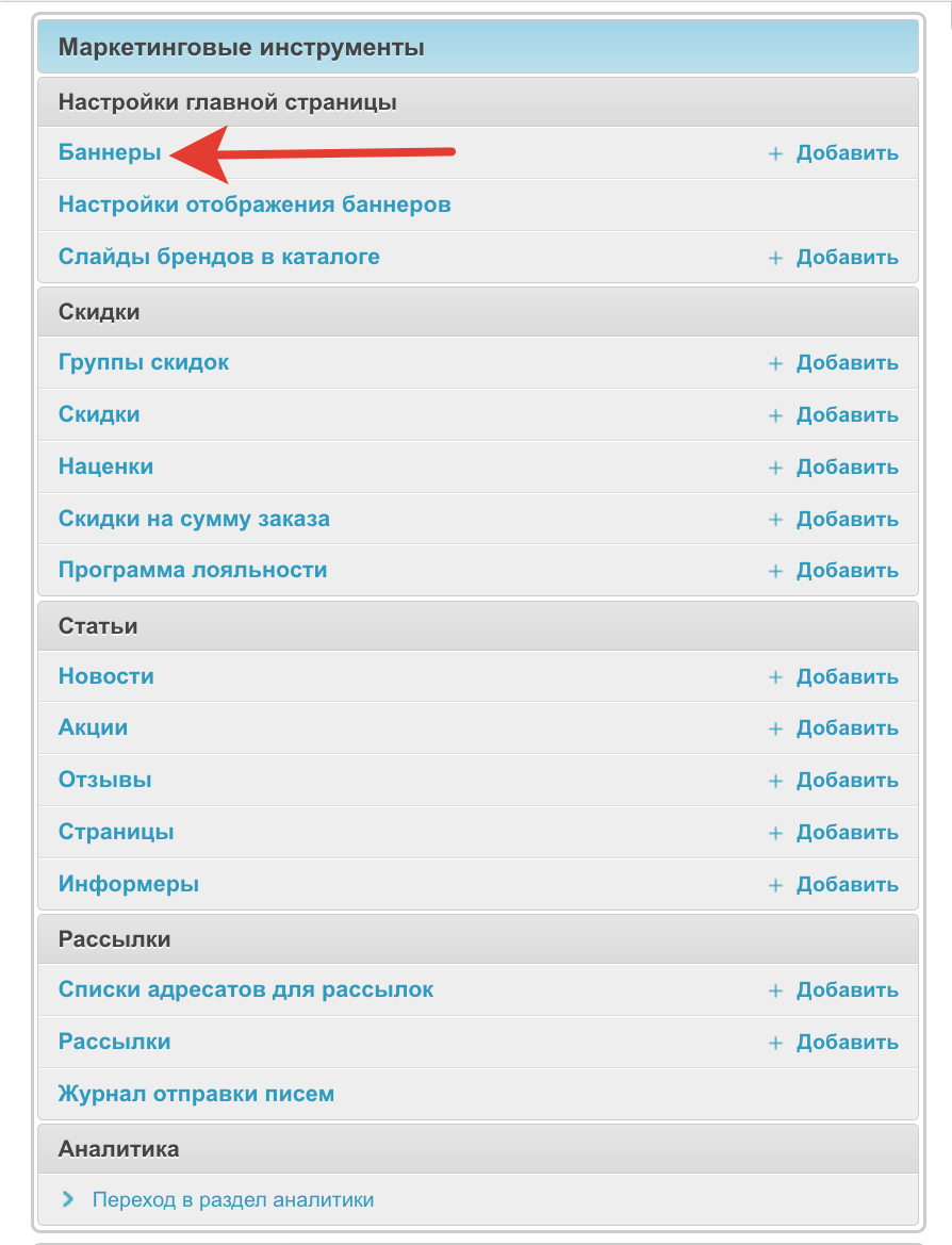 Осуществляется в административной панели проекта. После авторизации в панели администратора перейдите в раздел Баннеры.