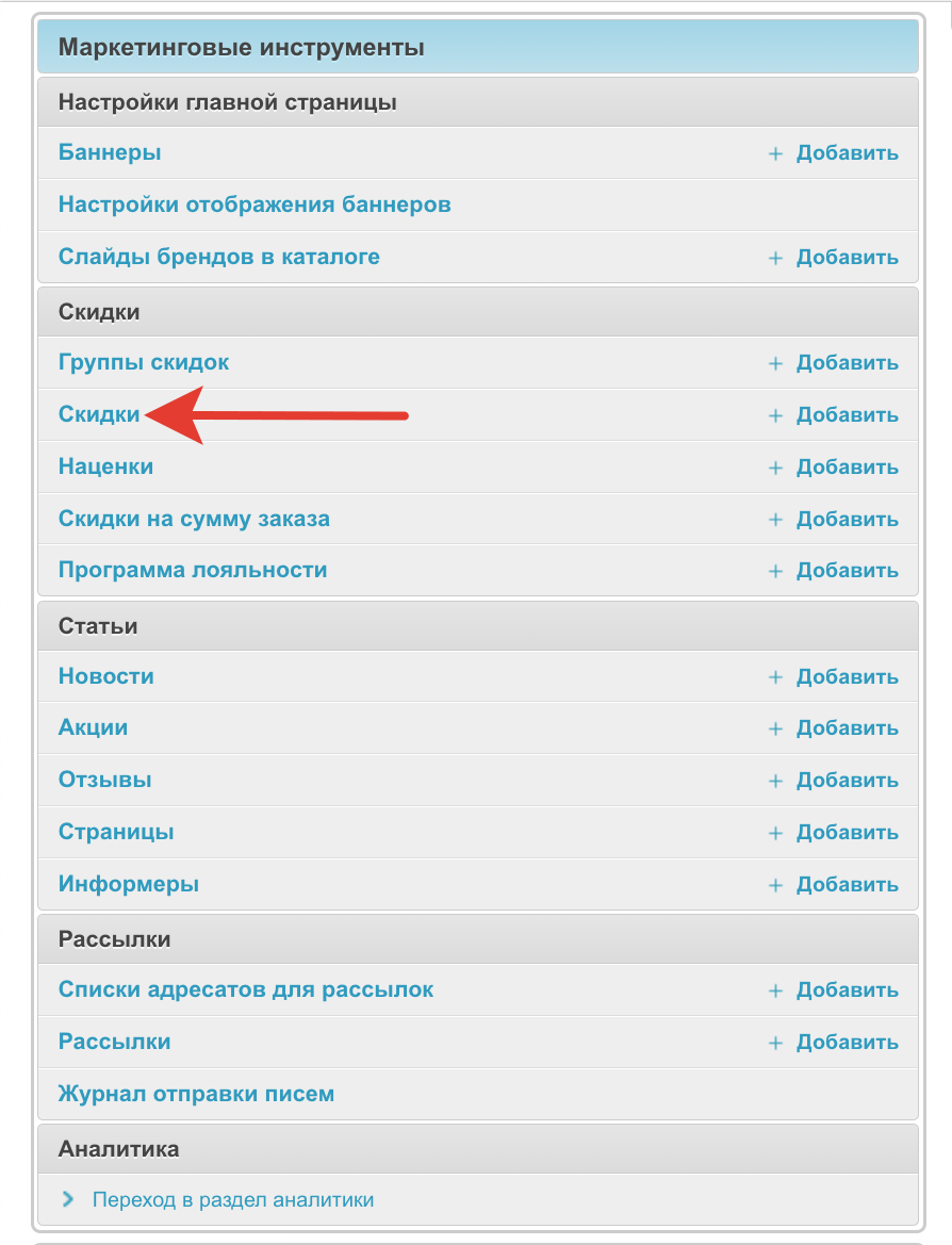 После добавления Группы скидок можно завести саму скидку. Для этого нужно открыть раздел Скидки в панели администратора.
