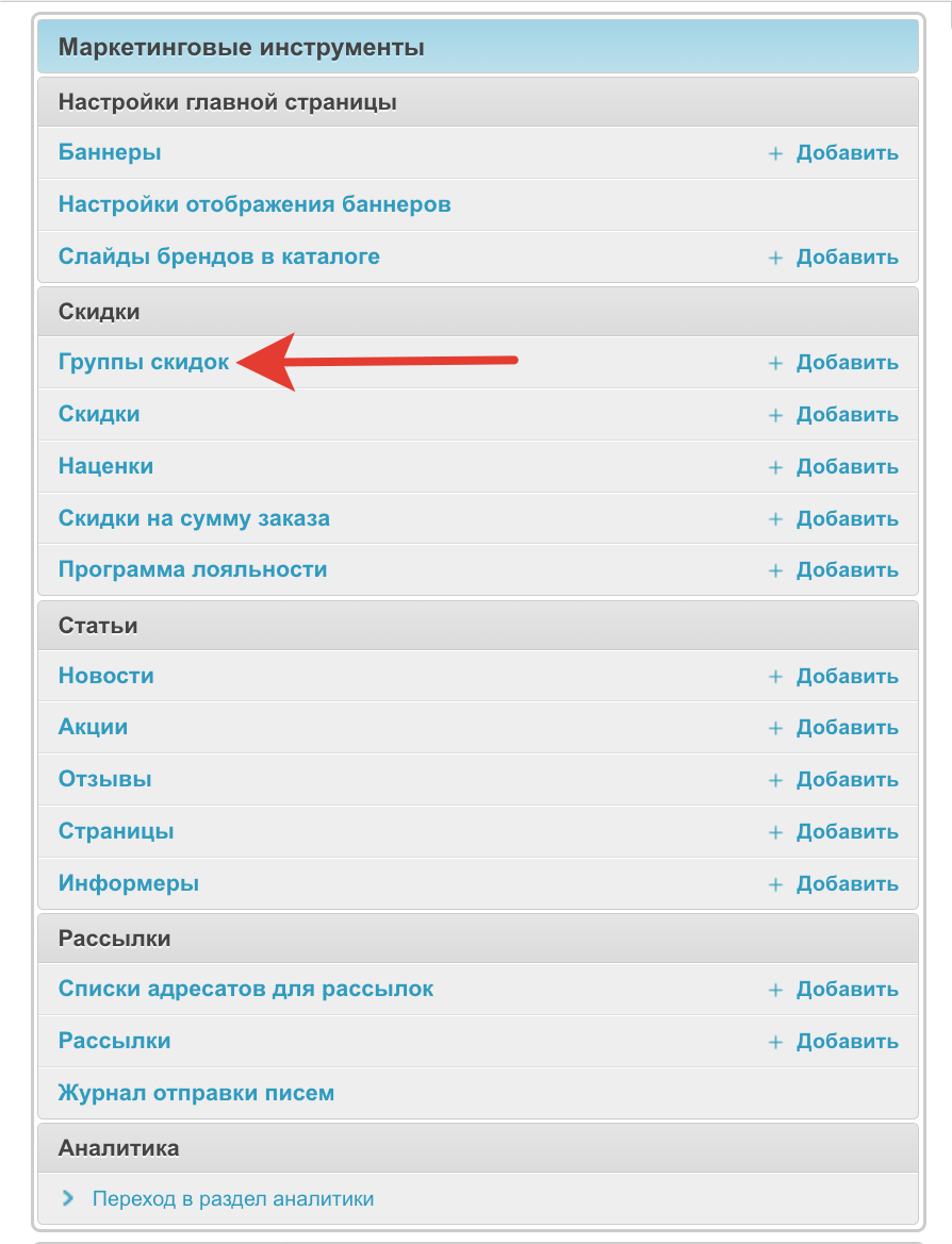 Перед добавлением скидки нужно предварительно завести Группу скидок, для этого необходимо перейти в одноименный раздел панели администратора.