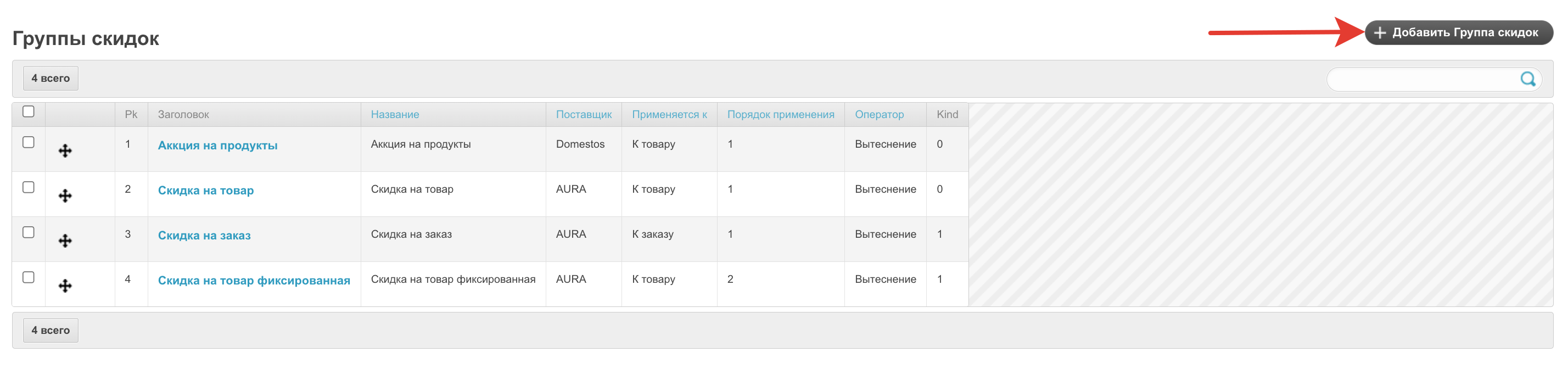 Для добавления новой группы надо нажать на кнопку Добавить Группа скидок.