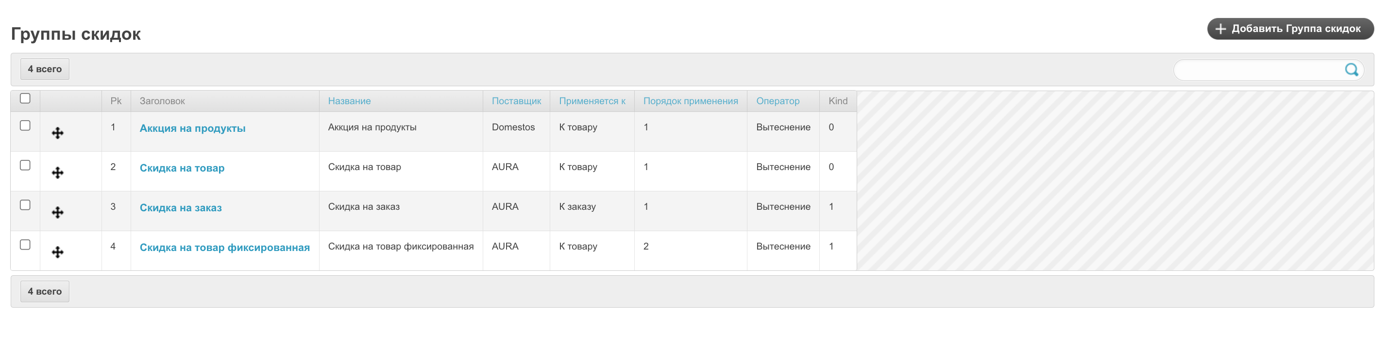На открывшейся странице будут указаны заведенные ранее группы скидок. Здесь можно изменить их порядок вывода и настройки.