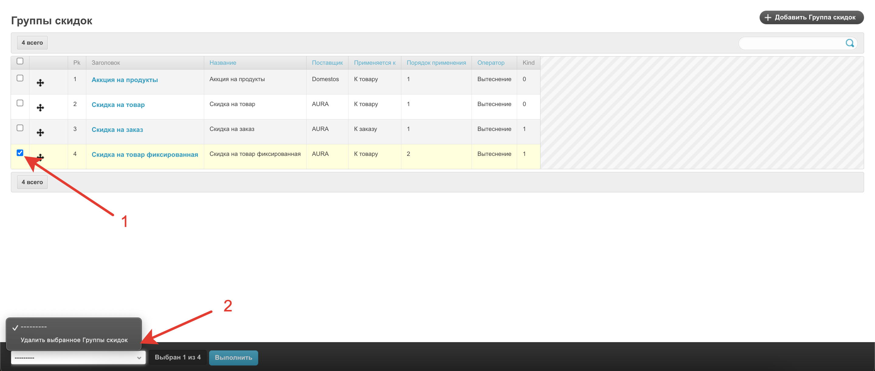 Для удаления группы скидок надо ее выделить в списке а далее в меню внизу страницы выбрать Удалить выбранное Группы скидок.