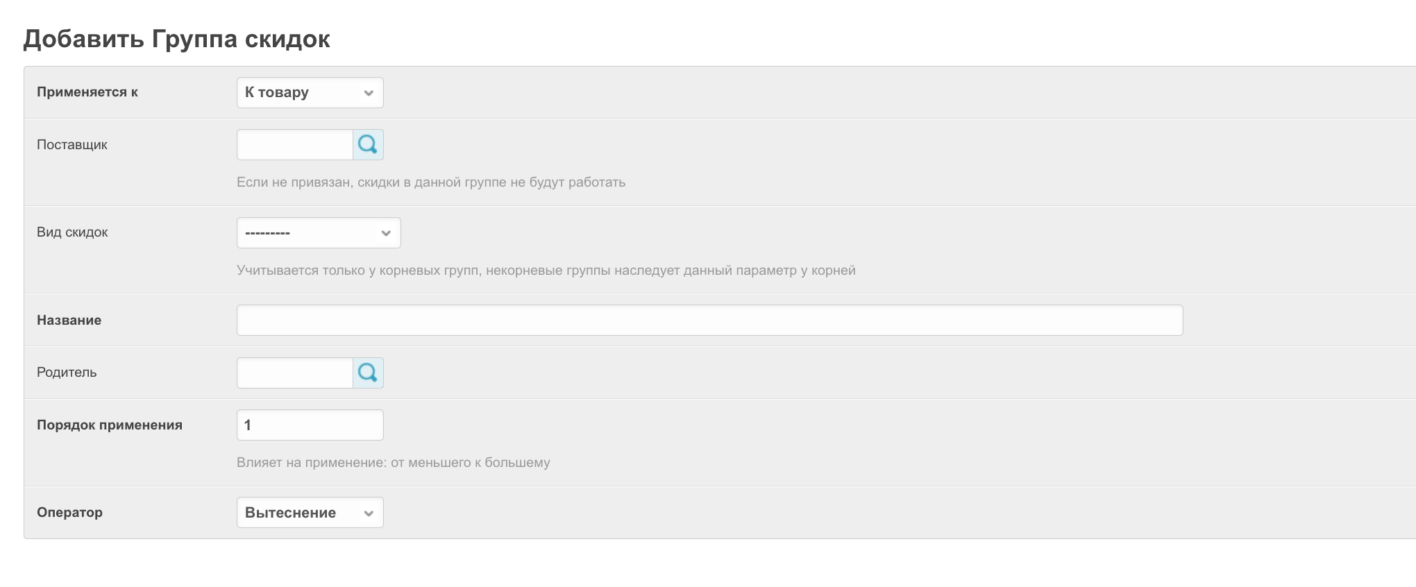Группа скидок - настраивается привязка к группе, которую заводили на предыдущем этапе.