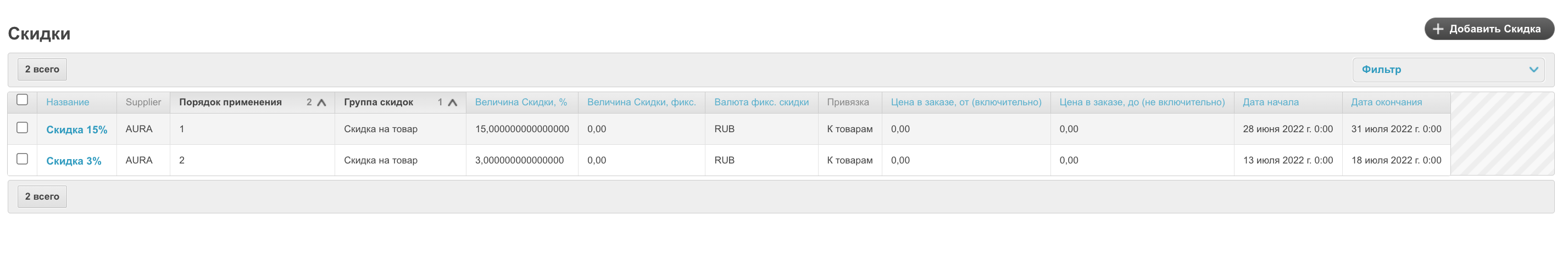 Для добавления новой скидки надо нажать на кнопку Добавить Скидка.