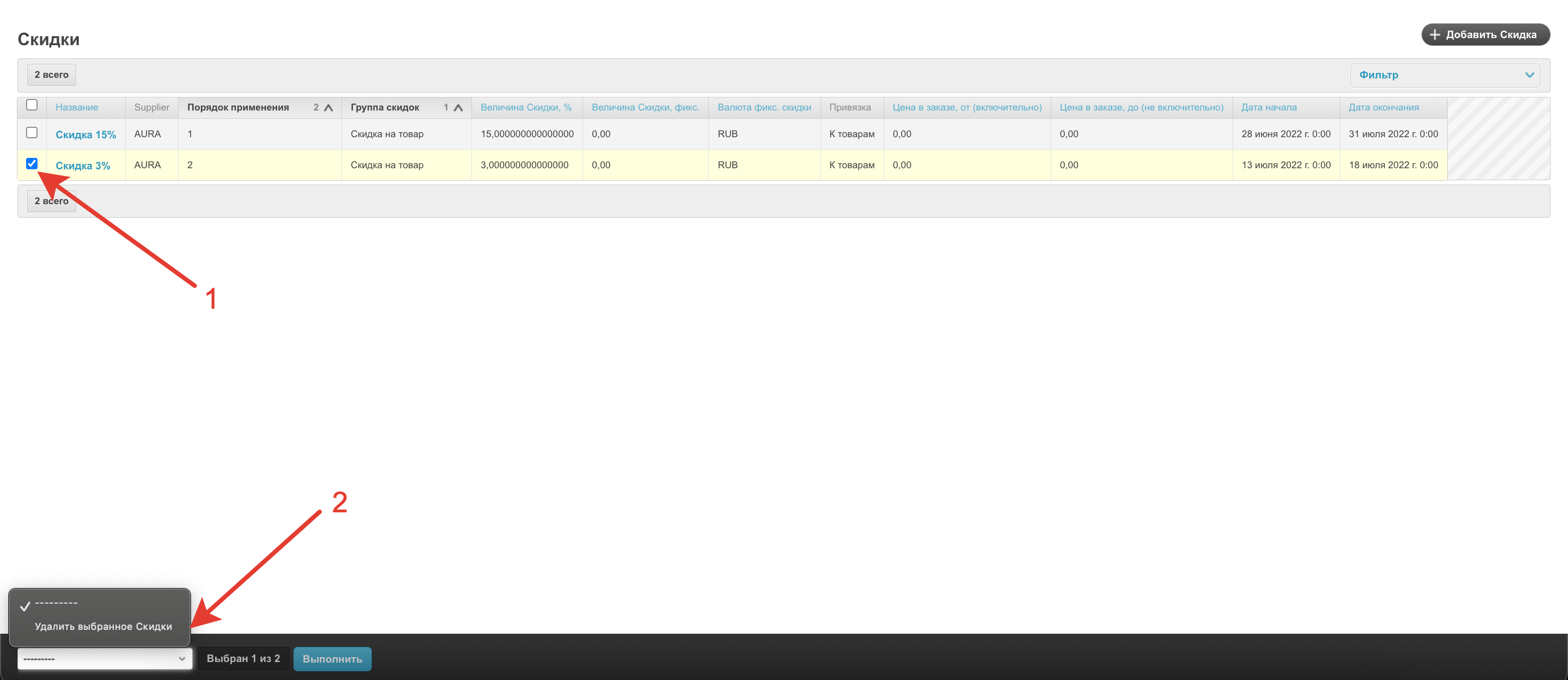 Для удаления скидки надо ее выделить в списке а далее в меню внизу страницы выбрать Удалить выбранное Скидки.