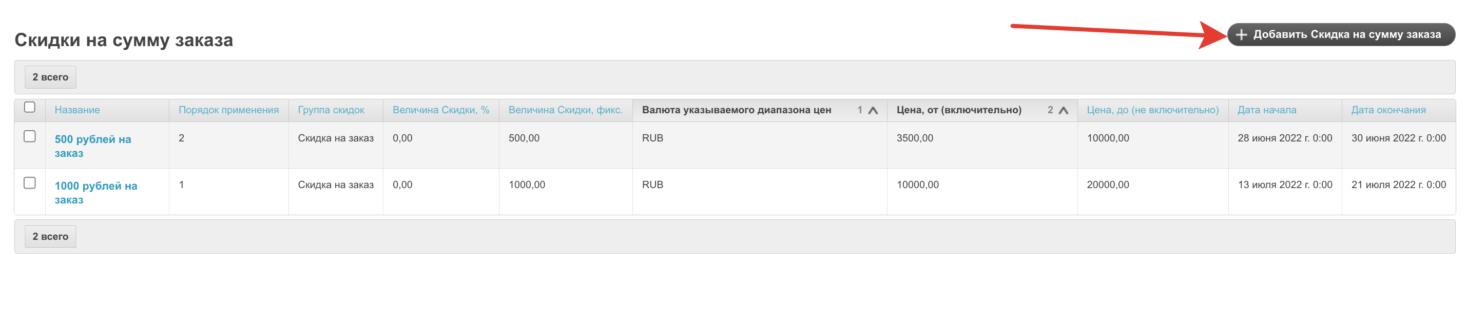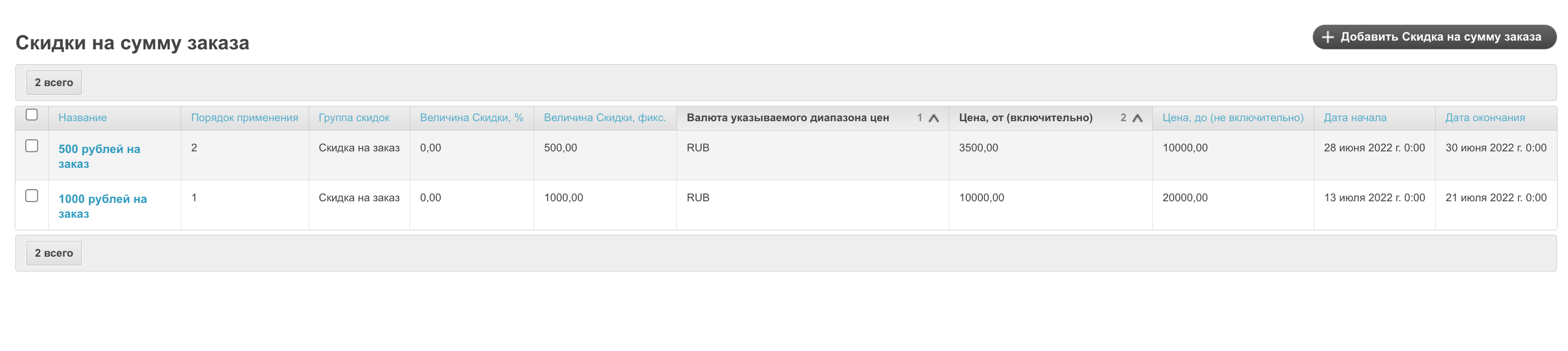 На странице будут отображены ранее добавленные скидки на сумму заказа.