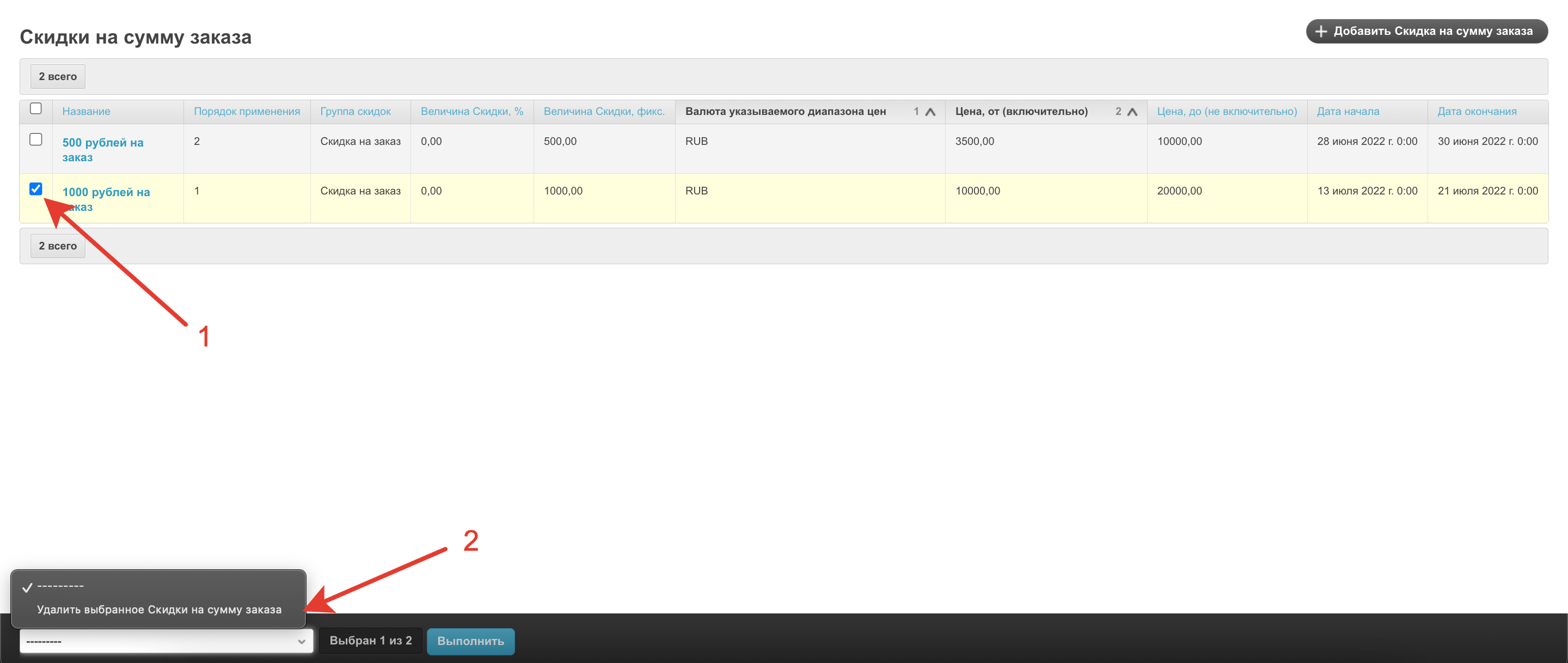 Для удаления скидки надо ее выделить в списке а далее в меню внизу страницы выбрать Удалить выбранное Скидки на сумму заказа.