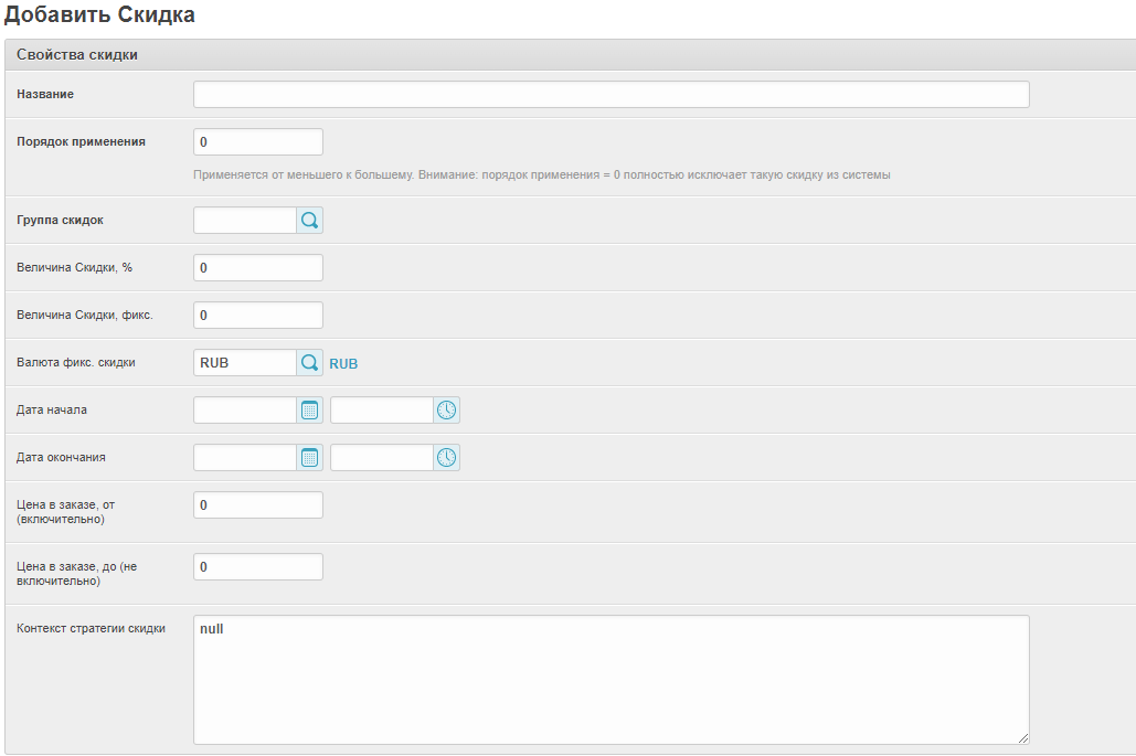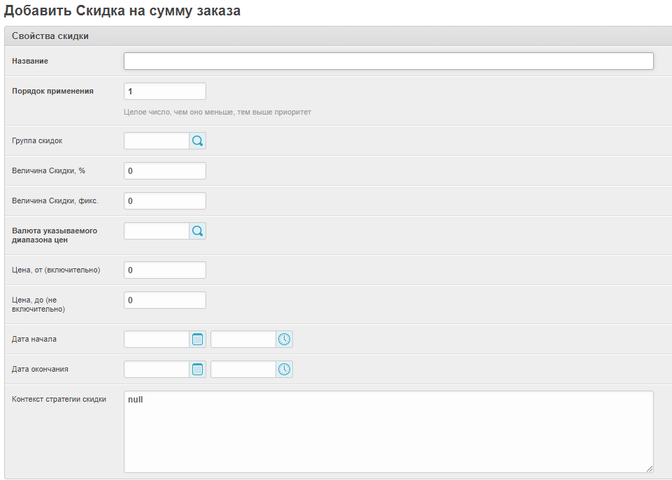 Дата начала, Дата окончания - дата и время начала и окончания действия скидки. При указании даты начала обязательно нужно указать дату окончания. Если скидка предполагается бессрочная, то укажите дату в далеком будущем.