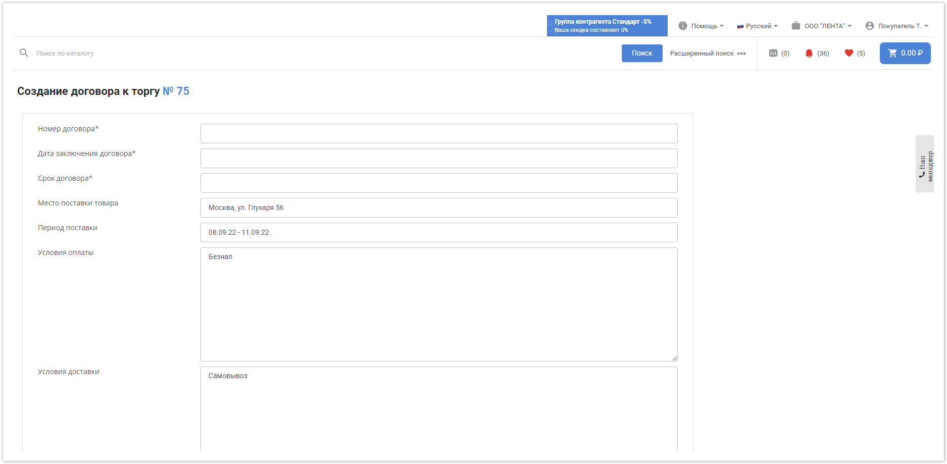 Номер договора — введите номер договора с поставщиком.