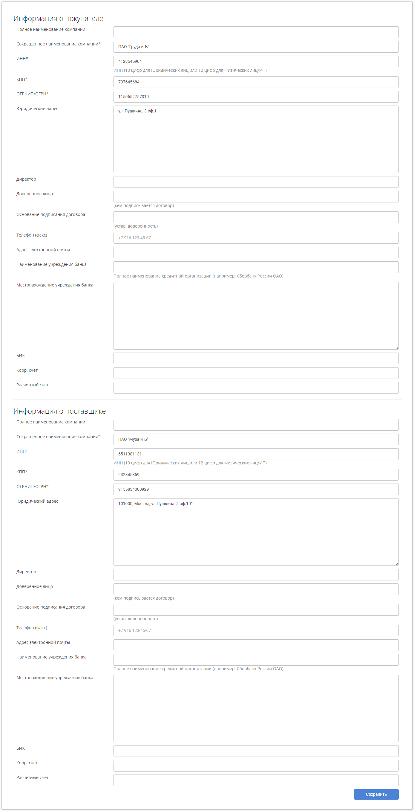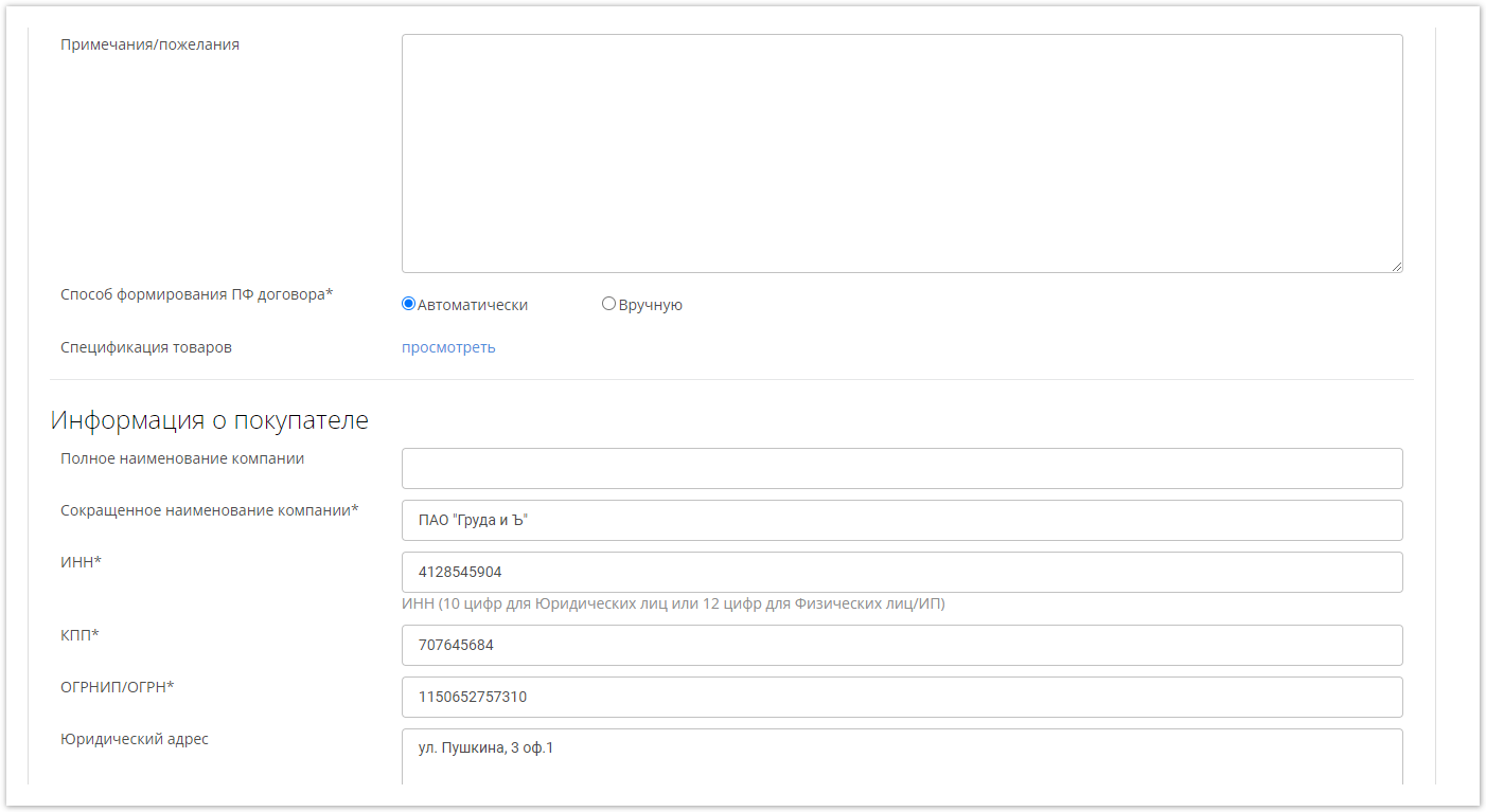 Далее следует информация о покупателе и поставщике. Данные из личных кабинетов подтягиваются автоматически, но их можно изменить при необходимости. Обязательные поля помечены значком *.